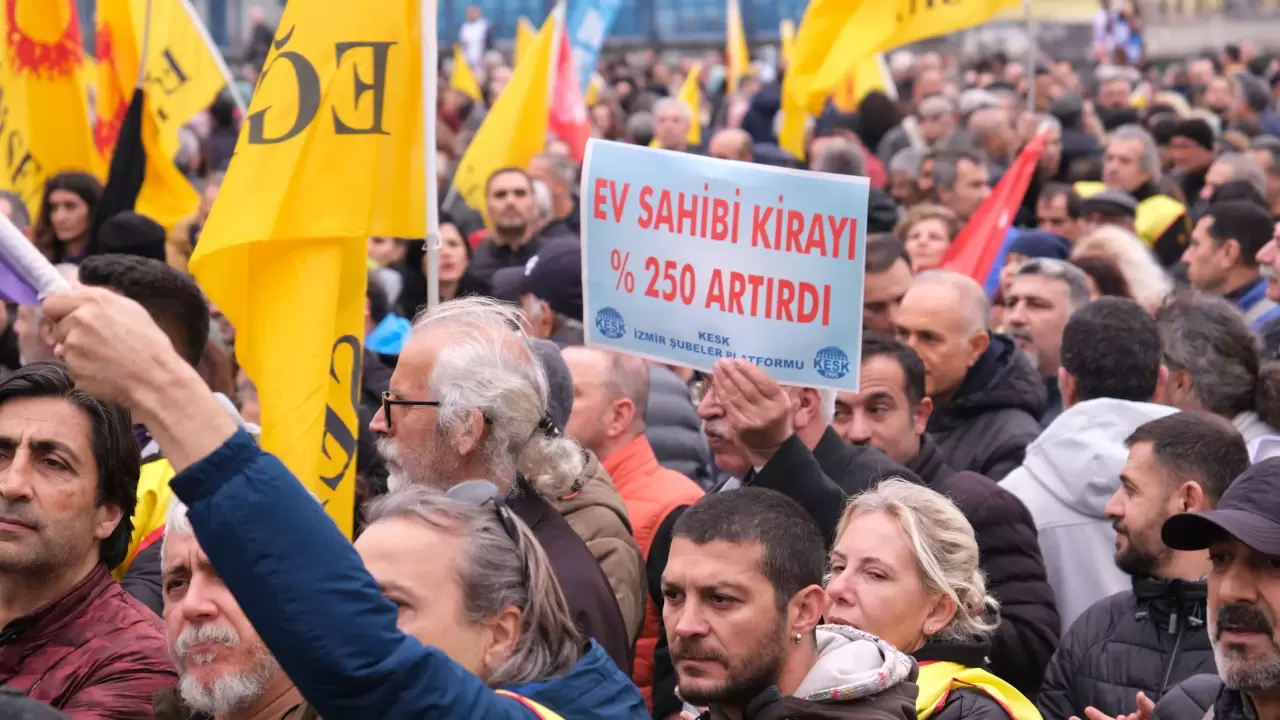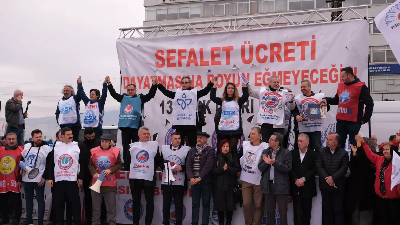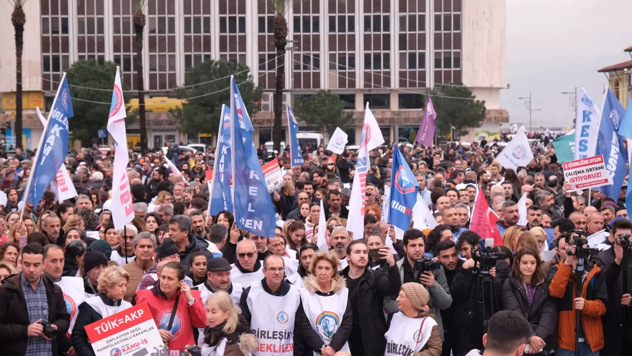 İzmir’de kamu çalışanları, Türkiye genelinde eşitlik ve adil gelir dağılımı talebiyle seslerini yükseltti. Konak ve Kültürpark’tan yürüyerek Cumhuriyet Meydanı’na gelen yüzlerce kamu emekçisi, hükümetin açıkladığı yüzde 11,54'lük zam oranını protesto etti. Eyleme Kamu Emekçileri Sendikaları Konfederasyonu (KESK), Birleşik Kamu İş Konfederasyonu, ASİM-SEN, BASK ve HÜR-SEN'e bağlı sendikaların üyeleri katıldı. Eylemciler, ekonomik eşitsizliğe karşı adalet talep ederken, sık sık “Adalet istiyoruz” ve “Sefalet ücretlerine hayır” sloganları attılar.