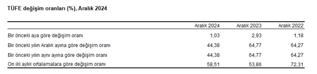 TÜİK’in açıkladığı veriler arasında, işlenmemiş gıda ürünleri, enerji, alkollü içkiler, tütün ve altın gibi belirli kalemler hariç tutulduğunda, Aralık 2024’teki TÜFE artışı bir önceki aya göre yüzde 1,17, bir önceki yılın aynı dönemine göre ise yüzde 43,94 olarak gerçekleşti. Bu oran, 12 aylık ortalamalar dikkate alındığında yüzde 58,37 seviyesine yükseldi. Bu veriler, tüketici fiyatlarının genel artışını daha net bir şekilde yansıtarak, özel kalemlerin etkisini gösteriyor.