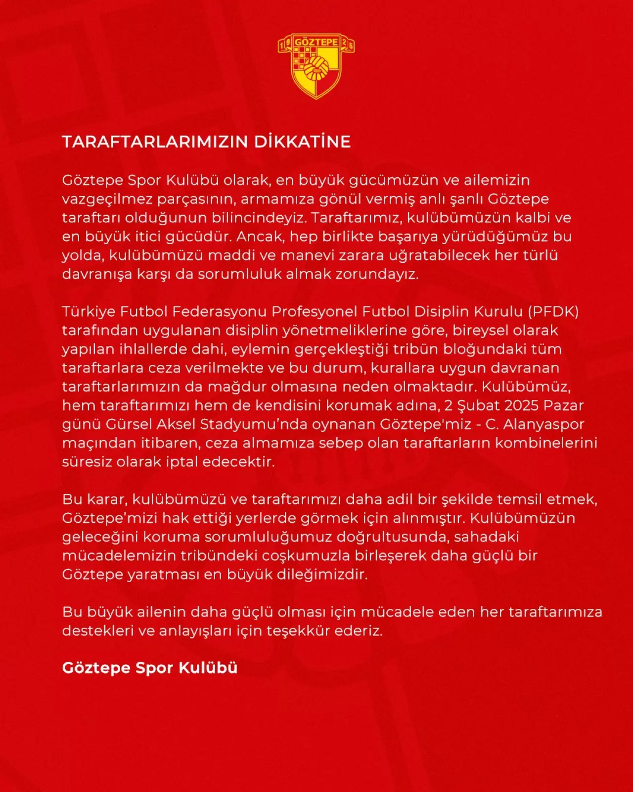 Türkiye Futbol Federasyonu Profesyonel Futbol Disiplin Kurulu (PFDK) tarafından uygulanan disiplin yönetmeliklerine göre, bireysel olarak yapılan ihlallerde dahi, eylemin gerçekleştiği tribün bloğundaki tüm taraftarlara ceza verilmekte ve bu durum, kurallara uygun davranan taraftarlarımızın da mağdur olmasına neden olmaktadır. Kulübümüz, hem taraftarımızı hem de kendisini korumak adına, 2 Şubat 2025 Pazar günü Gürsel Aksel Stadyumu’nda oynanan Göztepe'miz - C. Alanyaspor maçından itibaren, ceza almamıza sebep olan taraftarların kombinelerini süresiz olarak iptal edecektir.