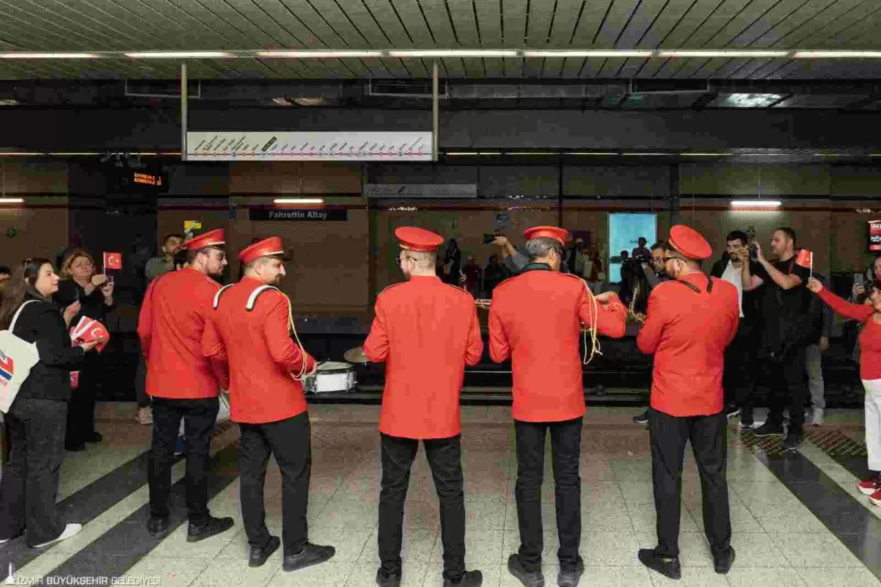 Türkiye Cumhuriyeti’nin kuruluşunun 101. yılı, İzmir’de büyük bir coşkuyla kutlanmaya devam ediyor. Günün son saatlerine kadar devam edecek 29 Ekim Cumhuriyet Bayramı kutlamaları kapsamında İzmir Büyükşehir Belediyesi Bando Ekibi, İzmirlilere sürpriz yaptı. Fahrettin Altay İstasyonu'ndan metroya binen bando ekibi; Konak, Çankaya ve Bornova istasyonlarında marşlarla İzmirliler'in 29 Ekim Cumhuriyet Bayramı’nı kutladı. İzmir Metrosu'nda yolculuk yapan yurttaşlar Cumhuriyet coşkusunu doyasıya yaşayarak, bayraklar ve alkışlarla marşlara eşlik etti.