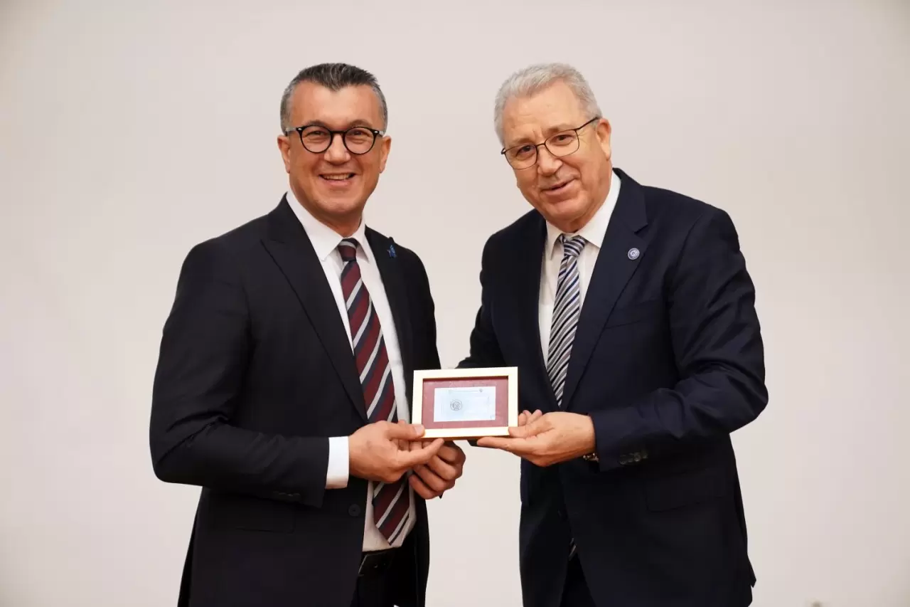 Konferansın sonunda Prof. Dr. Necdet Budak, Ege Üniversitesi'nin 70. yılı anısına PTT tarafından basılan ilk pulu ve plaketi TÜSEB Başkanı Prof. Dr. Ümit Kervan'a takdim etti.