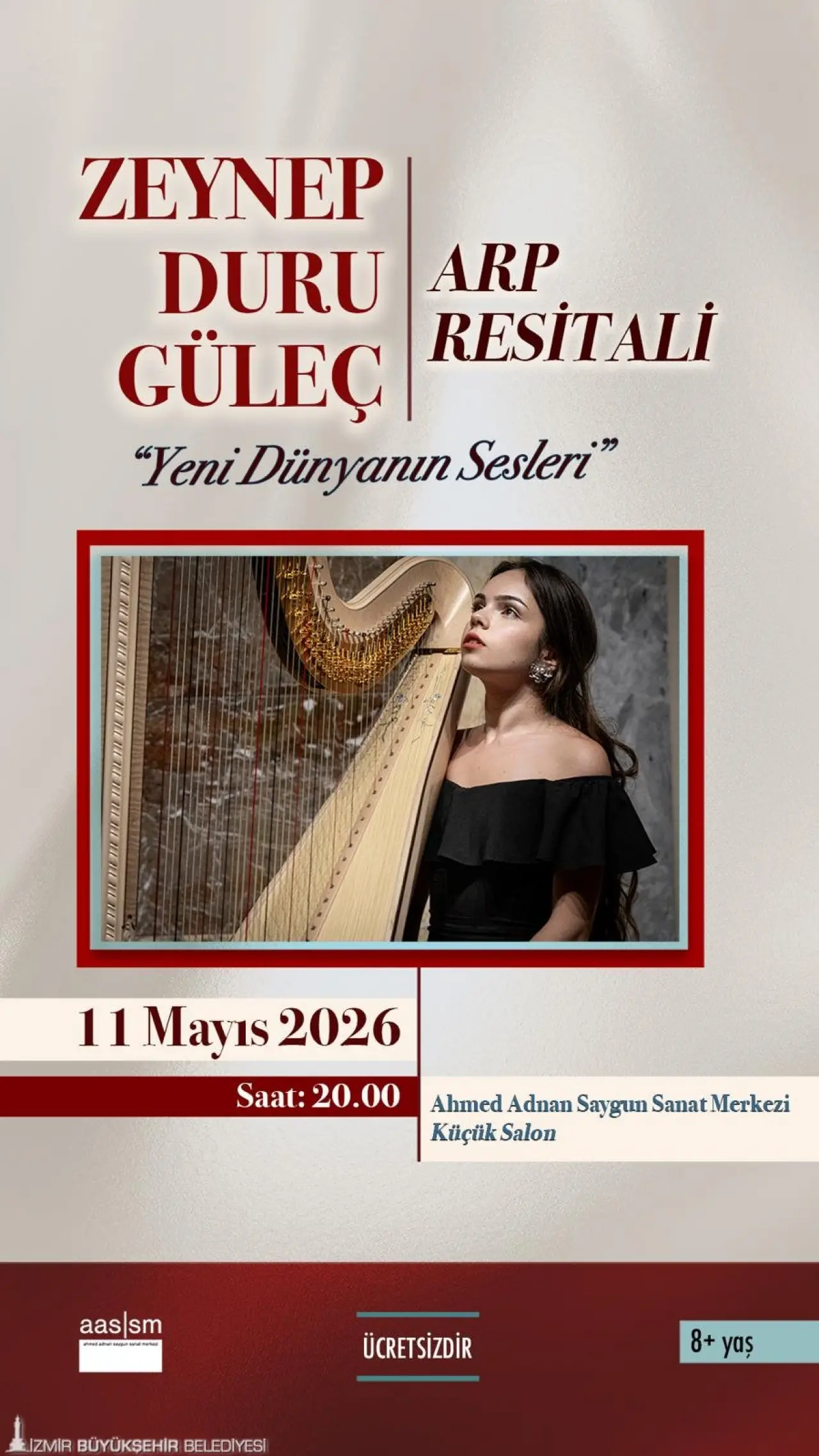 Küçük Salon’da yapılacak ücretsiz etkinlikler arasında, 11 Mayıs’ta arp sanatçısı Zeynep Duru Güleç’in resitali öne çıkıyor. Saat 20.00’deki “Yeni Dünyanın Sesleri” başlıklı konserde, John Cage, Yann Tiersen, Aram Khachaturian ve Arvo Pärt gibi 20. ve 21. yüzyılın yenilikçi bestecilerinin çağdaş, modern ve minimalist eserleri yer alacak.