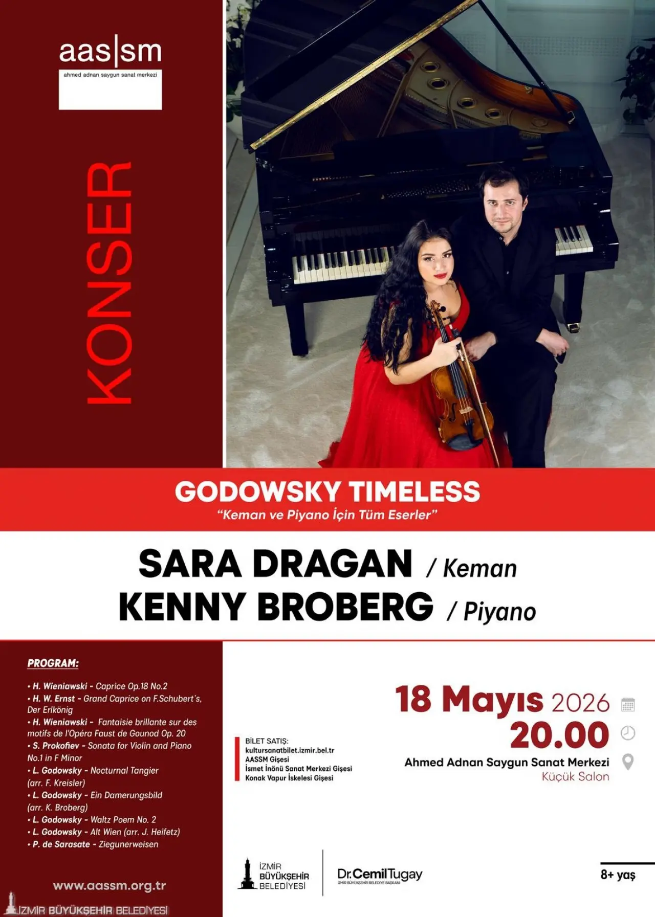 18 Mayıs saat 20.00’de Küçük Salon’da gerçekleşecek “Godowsky Timeless” konseri, keman sanatçısı Sara Dragan ile piyanist Kenny Broberg’i İzmirli sanatseverlerle buluşturacak. Program, Leopold Godowsky’nin eserleri üzerinden şekillenen ve transkripsiyon temasını merkezine alan özel bir seçki sunuyor. Biletler 30 Nisan saat 10.00 itibarıyla kultursanatbilet.izmir.bel.tr üzerinden ve AASSM, İsmet İnönü Sanat Merkezi ile Konak Vapur İskelesi gişelerinden satışa sunulacak.
