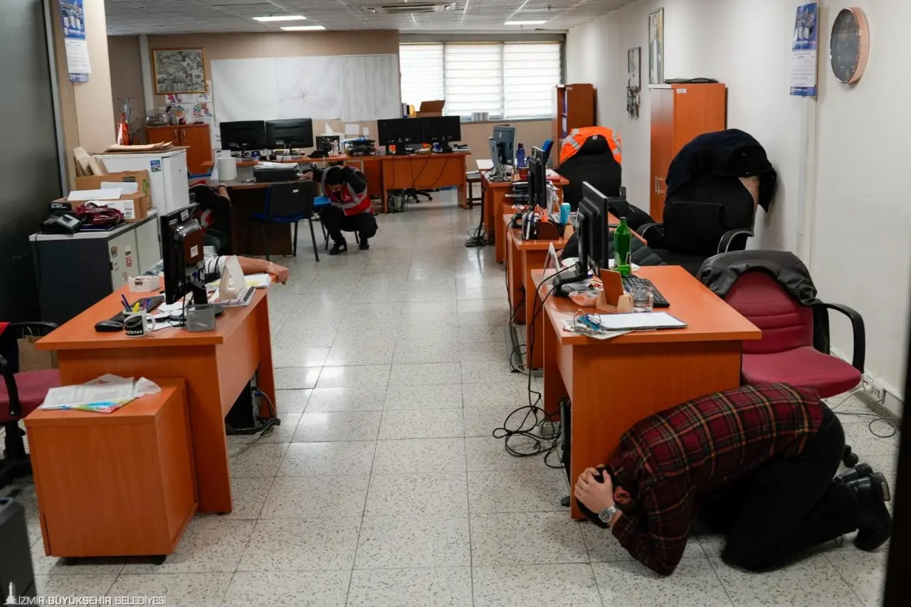 İzmir Büyükşehir Belediyesi Afet İşleri ve Risk Yönetimi Dairesi Başkanlığı öncülüğünde, İzmir Büyükşehir Belediyesi İtfaiye Dairesi Başkanlığı ekipleri tarafından Oğuzlar Ek Hizmet Binası’nda kapsamlı bir deprem ve yangın tatbikatı gerçekleştirildi. Kurum çalışanlarının acil durumlarda doğru, hızlı ve koordineli hareket edebilme becerisini geliştirmeyi amaçlayan tatbikat, gerçeğini aratmayan senaryosuyla dikkat çekti.