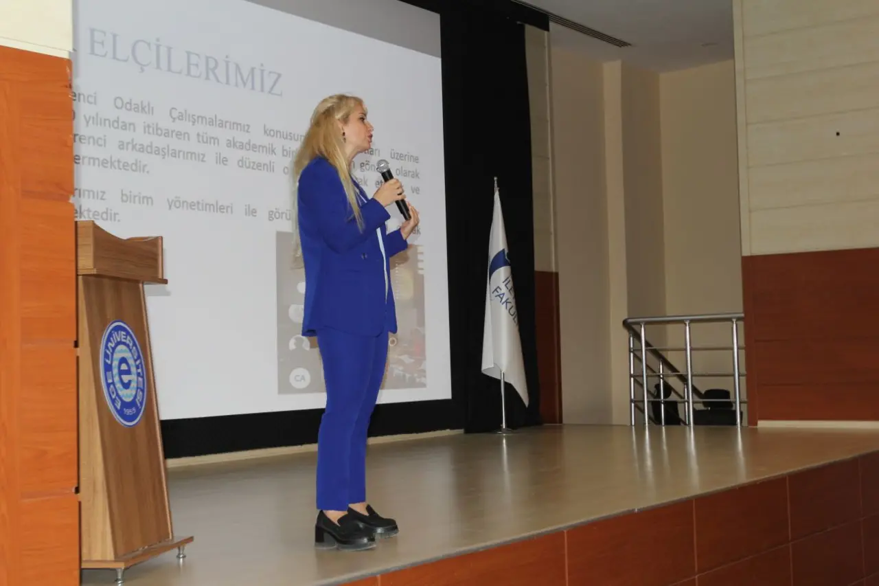 Seminerde, Ege Üniversitesi Kariyer Planlama Koordinatörü Öğr. Gör. Ebru Kalyoncu, öğrencilere yönelik yürütülen kapsamlı çalışmalar hakkında bilgi verdi. Etkinlikte; Yetenek Kapısı platformu, staj ve mentorluk fırsatları, kariyer danışmanlığı hizmetleri ile iş dünyasıyla kurulan güçlü iş birlikleri detaylı bir şekilde anlatıldı. Öğr. Gör. Kalyoncu, öğrencilerin 21. yüzyıl becerilerini kazanması ve geleceğin mesleklerine hazırlanması yönünde yürütülen farkındalık çalışmalarına dikkat çekti.
