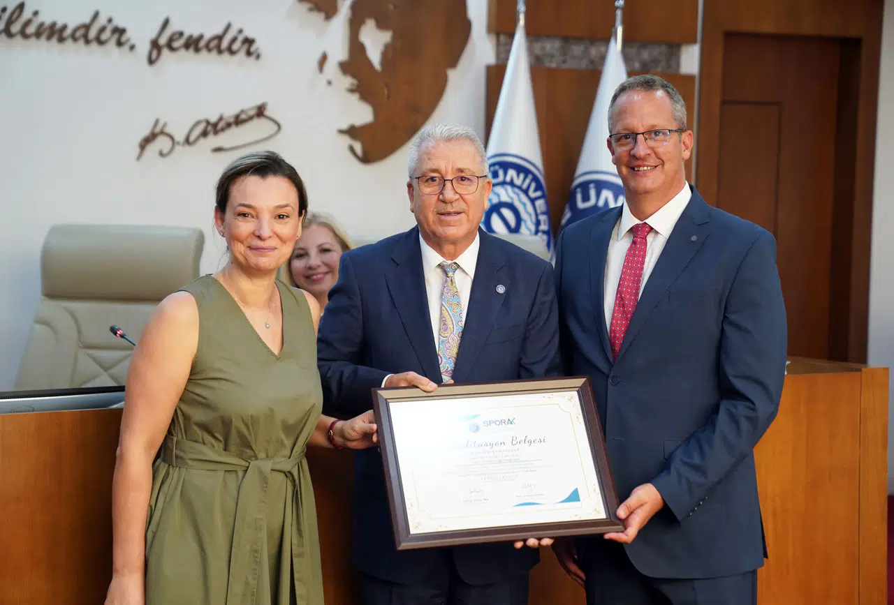Ege Üniversitesi Rektörü Prof. Dr. Necdet Budak, senato toplantısında akreditasyon belgesini Spor Bilimleri Fakültesi Dekanı Prof. Dr. Gülbin Rudarlı ve Spor Bilimleri Fakültesi Öğretim Üyesi Prof. Dr. Timuçin Gencer’e takdim etti.