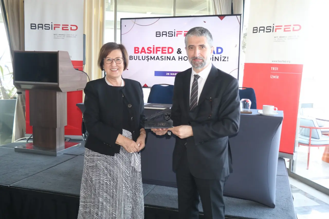 Toplantı sonunda BASİFED Yönetim Kurulu Başkanı Semiha Güneş, TÜSİAD Yönetim Kurulu Başkanı Ozan Diren’e plaket, “İzmir’in Çarşıları” kitabı ile Atatürk figürlü masa isimliği hediye etti.
