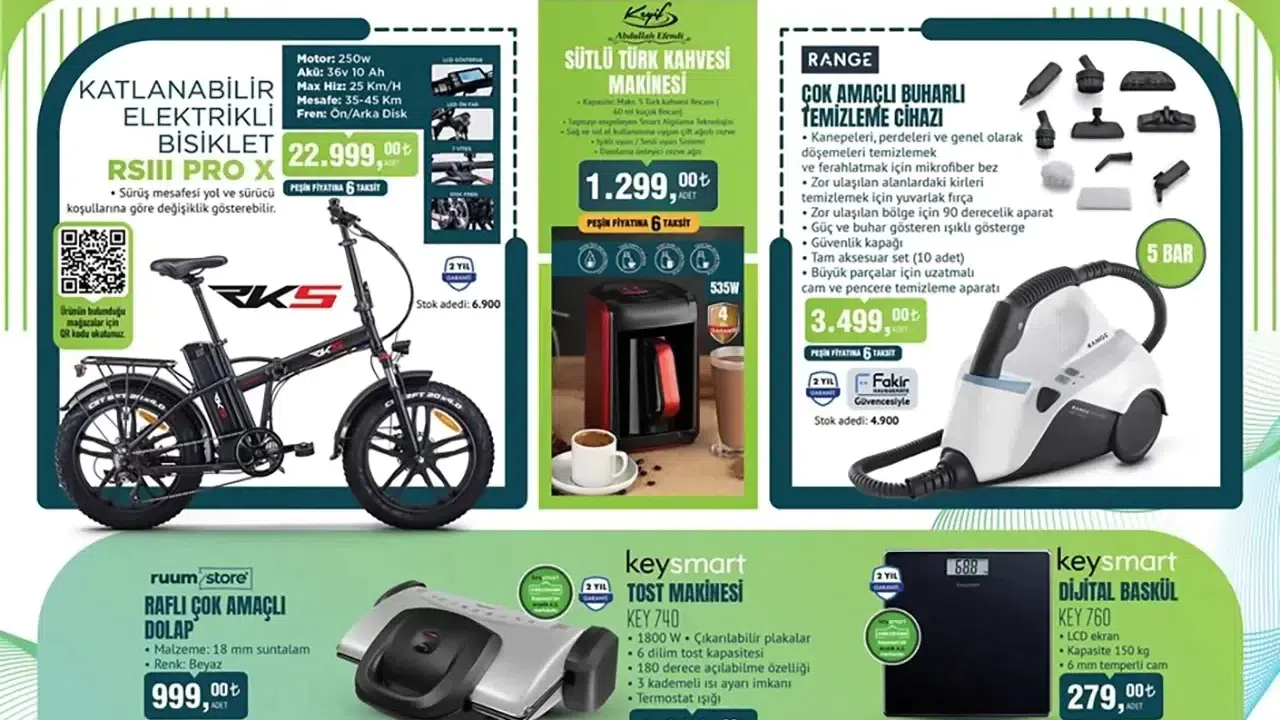 Bu hafta Bim, alışılmışın dışında büyük bir indirim kataloğu sunuyor. Katalogda farklı boyutlarda ve çeşitlerde birçok ürün yer alıyor. Öne çıkan ürünler arasında Skyjet Rivero 125cc motosiklet bulunuyor; bu motosiklet, peşin fiyatına 12 taksit avantajıyla ve 99.000 TL fiyat etiketiyle satışa sunuluyor. Senna markalı televizyonlar da ilgiçekiyor: 55 inç Ultra HD Google TV 12.999 TL ve 32 inç HD Ready Android TV 4.799 TL’den satışta. Ayrıca, RKS katlanabilir elektrikli bisiklet 22.999 TL ve peşin fiyatına 6 taksit avantajıyla 6.900 adet stokla sunuluyor. Range çok amaçlı buharlı temizleme cihazı ise 3.499 TL fiyatla ve 4.900 stok adetiyle raflarda yer alıyor. Sütlü Türk kahvesi makinesi 1.299 TL’den satılıyor. Tost makinesi, mutfak tartısı, elektronik su pompası ve çeşitli ev eşyaları da uygun fiyatlarla sizlerle buluşacak.