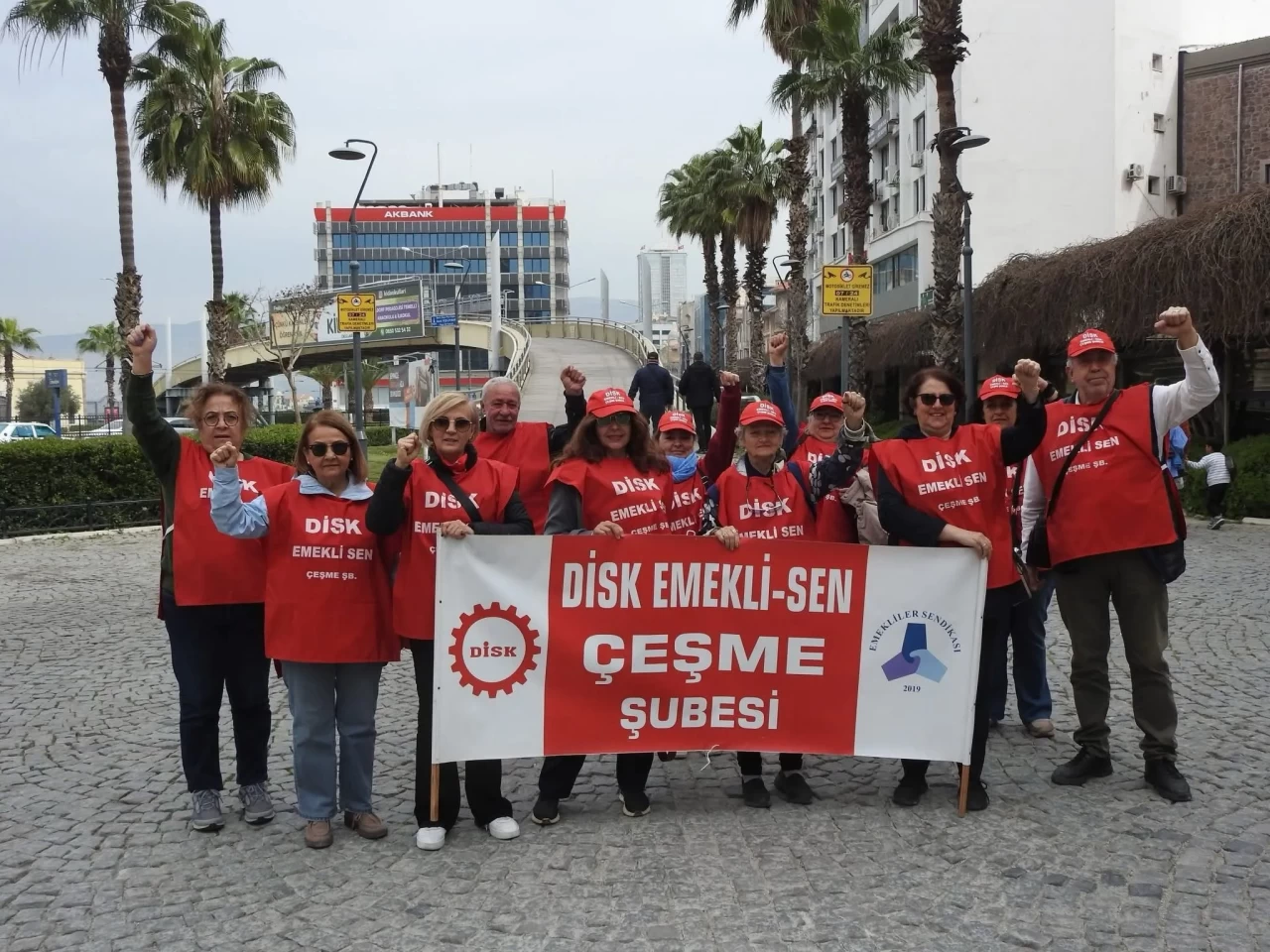 Devrimci İşçi Sendikaları Konfederasyonu (DİSK) Emekliler Sendikası, Konak SGK önünde emekliye ödenecek 4 bin TL’lik bayram ikramiyeleri hakkında basın açıklaması düzenledi. Açıklamayı, DİSK Emekli-SEN Merkez Yürütme Kurulu Üyesi Ercan Çınarlı okudu. Çınarlı açıklamasında, “Önümüz bayram. Emekli aylıklarımız henüz cebimize girmeden ayın başında erimişken, emekli bayram ikramiyeleri 4 bin lira olarak belirlendi. Ne var ki bu ikramiye ne faturalarımızı denkleştirmemize ne borçlarımızı azaltmamıza ne de torunlarımızla bayramlaşmamıza yetecek” diye konuştu.