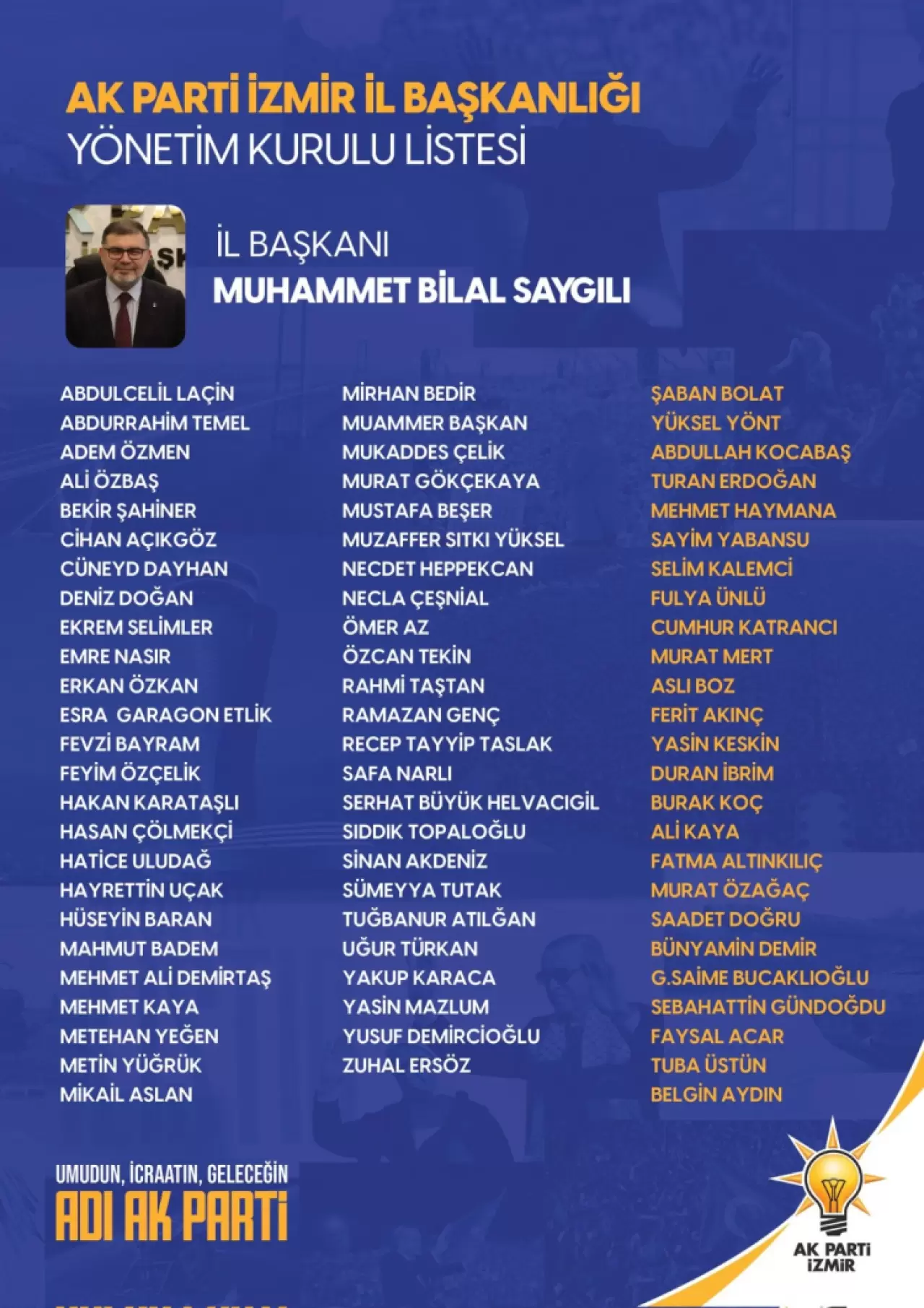 Kongre sonucunda açıklanan yeni yönetim kurulu listesi, partinin İzmir’deki yapılanmasında önemli bir adım olarak değerlendiriliyor. Mevcut İl Başkanı Bilal Saygılı’nın liderliğinde şekillenen yeni kadro, partinin bölgedeki etkinliğini artırmayı hedefliyor.