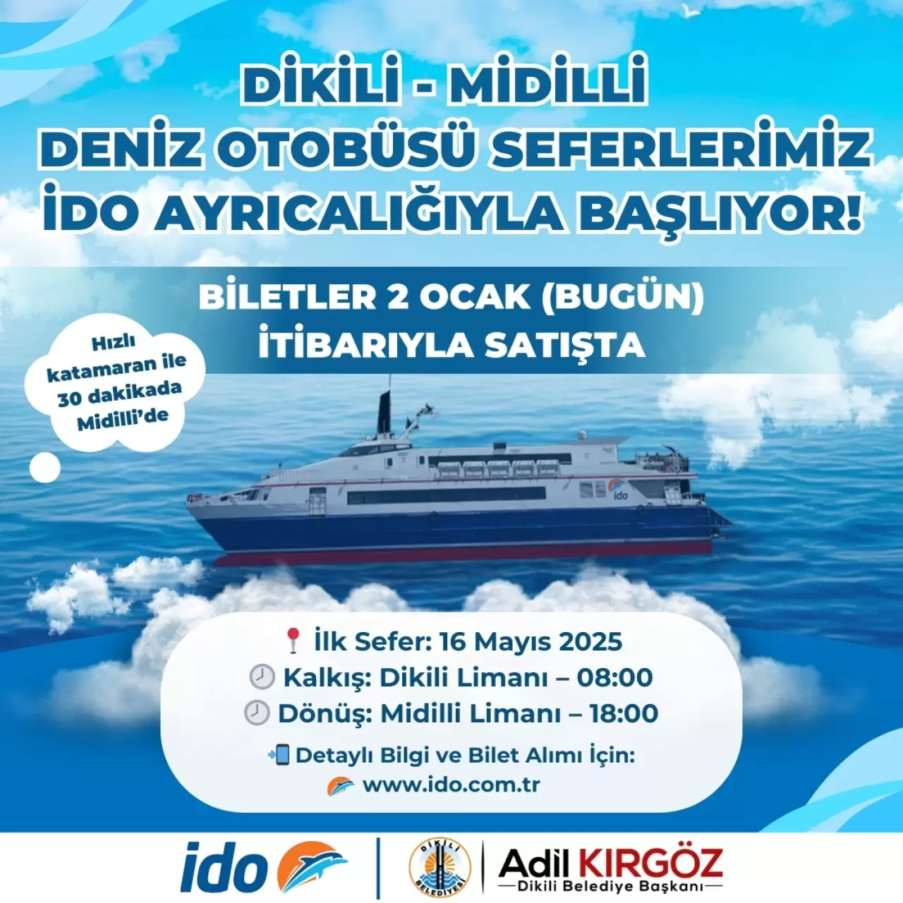 Dikili-Midilli hattında ilk sefer, 16 Mayıs 2025 Cuma günü saat 08.00’de Dikili Limanı’ndan hareket edecek. Aynı gün saat 18.00’de Midilli Limanı’ndan dönüş yapılacak. Hızlı katamaranlar sayesinde, yolculuk yalnızca 30 dakika sürecek. Bu yeni ulaşım hizmeti, özellikle yaz sezonunda bölge halkı ve turistler için önemli bir kolaylık sağlayacak.