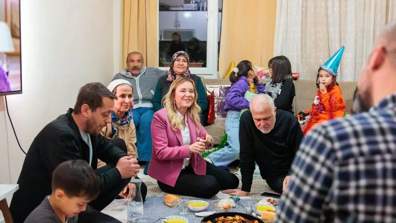 Necla ve İrfan Duruk çiftinin evine misafir olan Başkan Mutlu’ya, eşi Necip Mutlu ve Kılıç Reis Mahalle Muhtarı Filiz Sezer eşlik etti. Çocuklarla birlikte pasta kesen, aile üyelerine hediyeler takdim eden Başkan Mutlu, özellikle çocukların mutluluğunu paylaşarak geceye renk kattı.