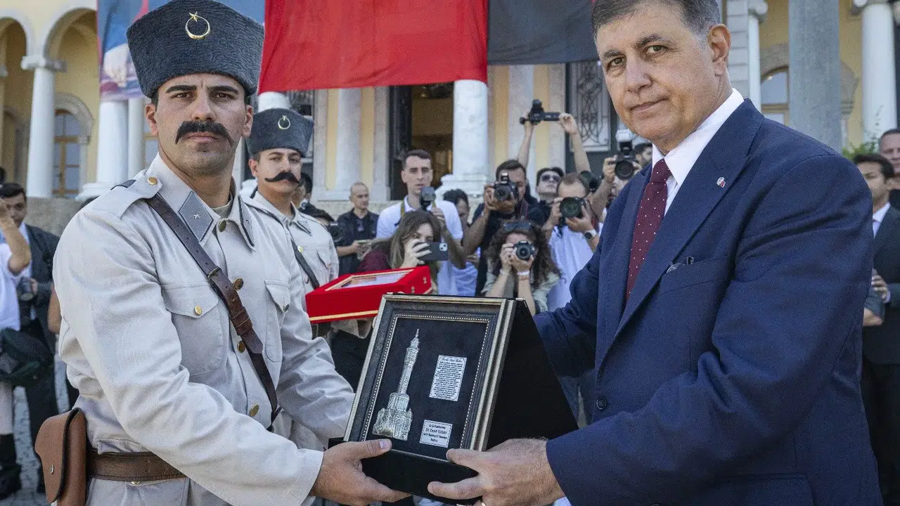Konak Atatürk Meydanı’na gelen süvari birlikleri, kentin kurtuluşunu simgeleyen tarihi sahneyi bir kez daha canlandırdı. İzmirlilerin alkışları arasında bir asker Türk Bayrağı’nı Hükümet Konağı’nın gönderine çekti. İzmir Büyükşehir Belediye Başkanı Dr. Cemil Tugay Yüzbaşı Şerafettin’i temsil eden Süvari Birlikleri Komutanı’na teşekkür plaketi sundu.