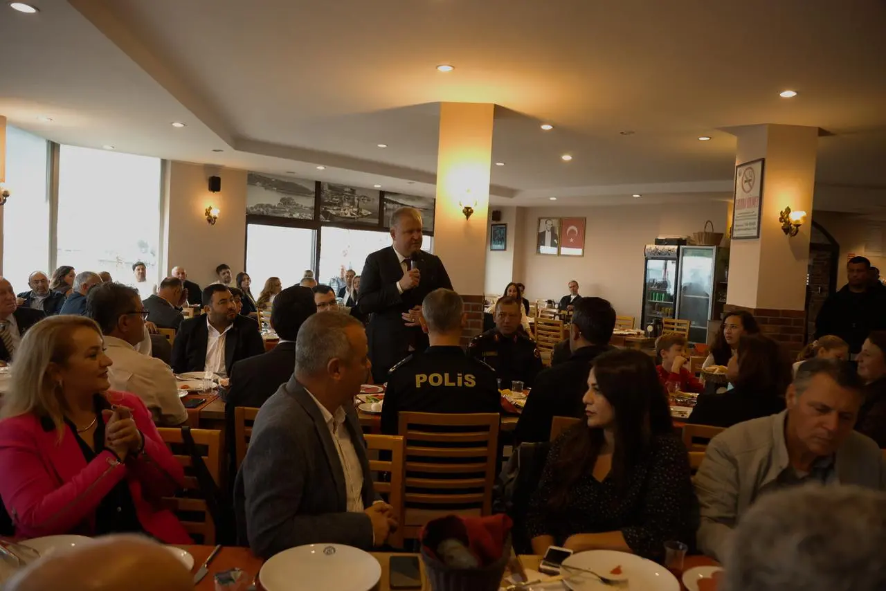 Urla Belediye Başkanı Selçuk Balkan, düzenlenen kahvaltı etkinliğinin ardından muhtarlara Türk Bayrağı ve Zeytin Fidanı hediye etti.