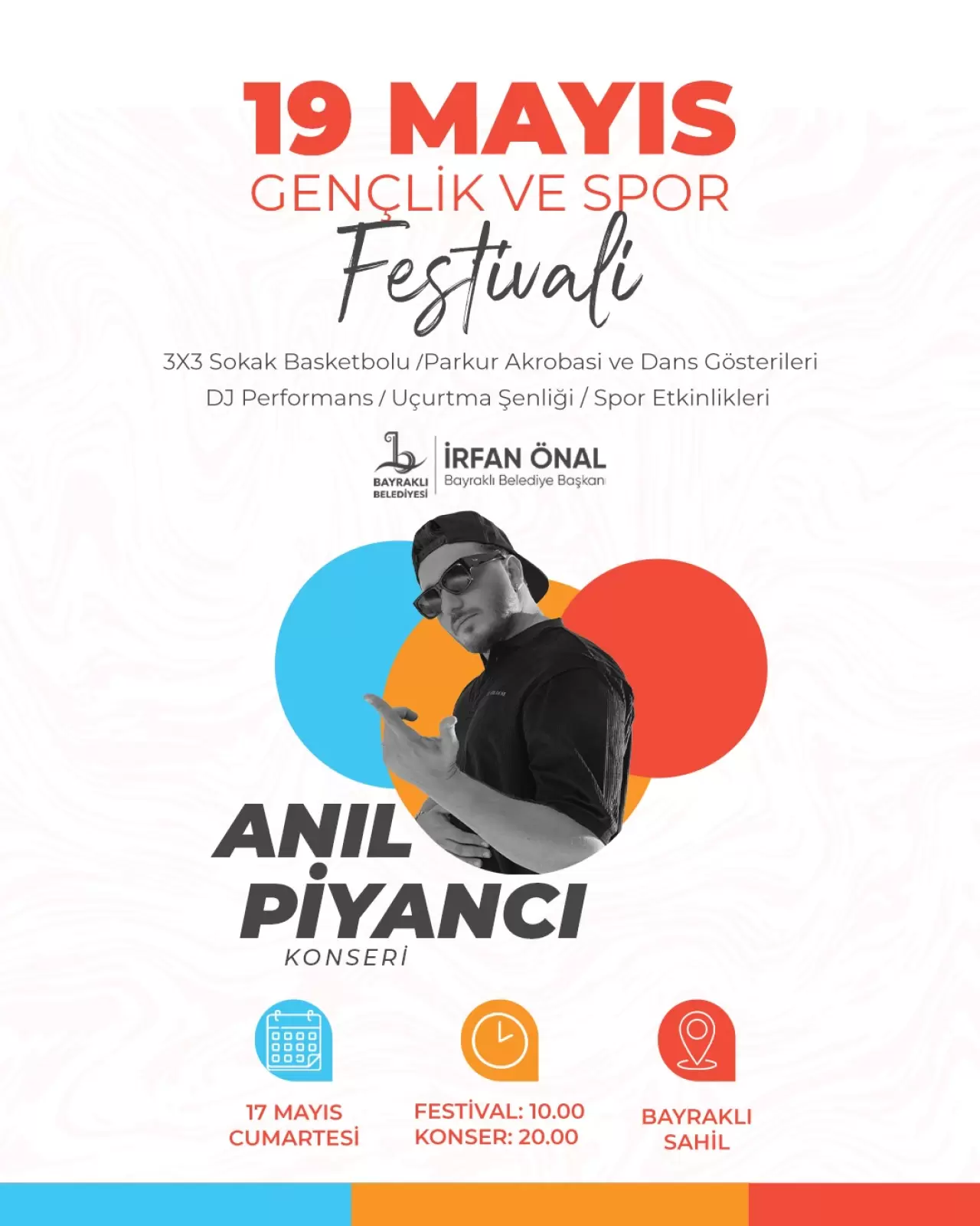 Bayraklı Belediyesi tarafından organize edilen 19 Mayıs kutlamaları, 17 Mayıs Cumartesi günü Bayraklı sahilinde sabah 10.00’da başlayacak. Etkinlikler kapsamında; survivor parkuru, çuval ve halat çekme yarışları, penaltı ve basketbol atışları, voleybol, hentbol ve badminton turnuvaları, zumba, tekvando, karate, jimnastik ve bale gösterileri, sokak basketbolu turnuvası, parkur akrobasi ve extreme rampa show, break dans performansları ve uçurtma şenliği gibi birçok etkinlik katılımcılarla buluşacak. Gün sonunda DJ performansının ardından, saat 20.00’da ünlü sanatçı Anıl Piyancı sahneye çıkacak. Etkinlik programının tüm detaylarına Bayraklı Belediyesinin sosyal medya hesaplarından ulaşılabilecek.