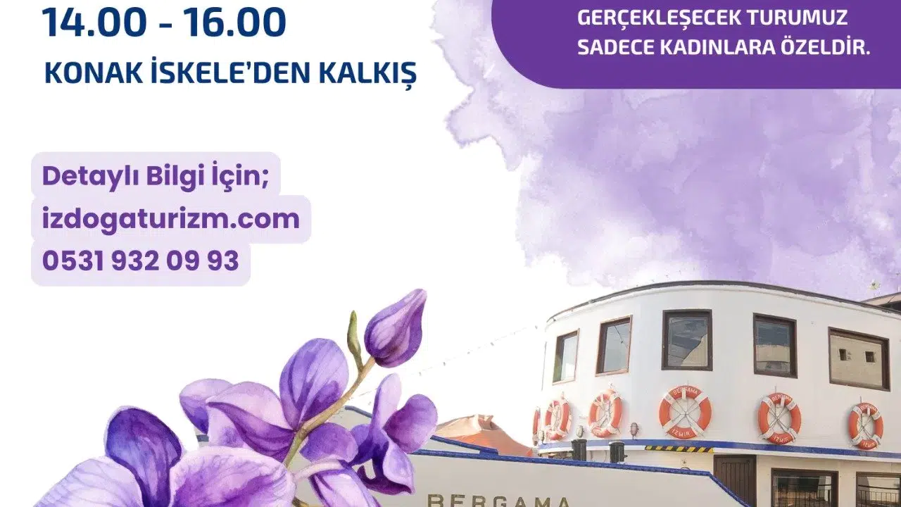 İzmir Büyükşehir Belediyesi şirketleri İZDENİZ ve İZDOĞA ortaklığında tarihi Bergama Vapuru ile Körfez’de düzenlenen turlar 8 Mart Dünya Emekçi Kadınlar Günü’ne özel programla devam edecek. Sadece kadınlara özel tur 8 Mart 2025 Cumartesi günü 14.00 ile 16.00 saatleri arasında olacak. Konak Vapur İskelesi’nden hareket edip yine aynı iskelede sona erecek tur boyunca kadınlar DJ performansı eşliğinde keyifli vakit geçirecek.