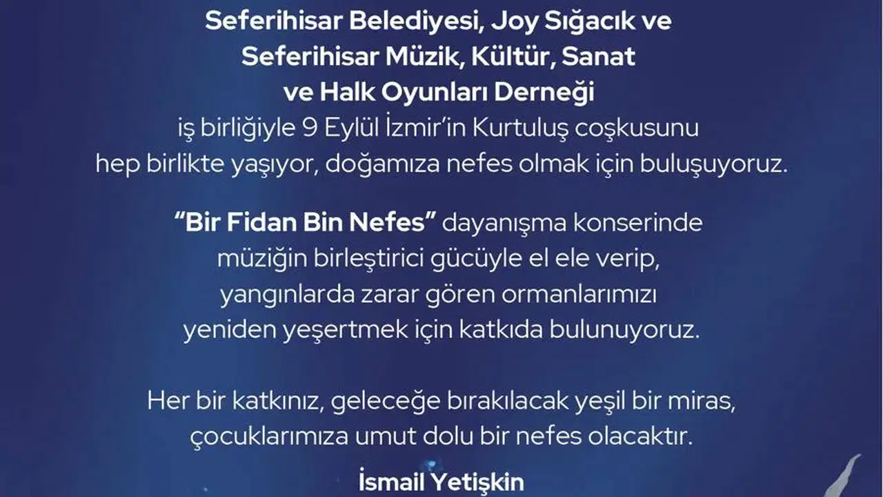 Seferihisar Belediyesi, Joy Sığacık ve Seferihisar Müzik, Kültür, Sanat ve Halk Oyunları Derneği iş birliğiyle 9 Eylül’de orman yangınlarında zarar gören alanlar için anlamlı bir dayanışma konseri düzenleniyor. “Bir Fidan Bin Nefes” başlığıyla gerçekleştirilecek etkinlikte Seferihisarlılar hem kurtuluş gününün coşkusunu hem de doğaya nefes olmanın gururunu yaşayacak.