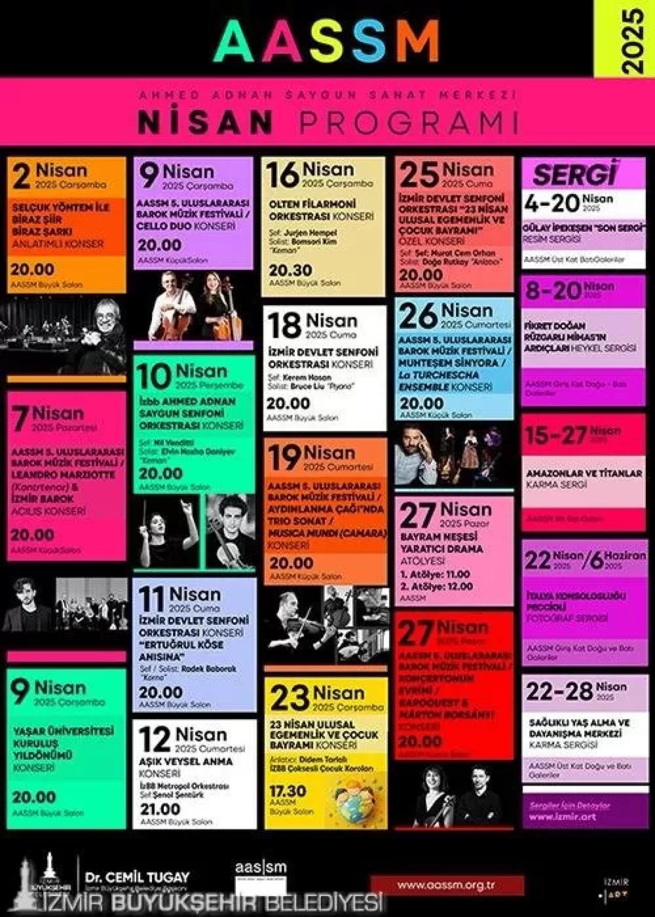 İzmirliler, Ahmed Adnan Saygun Sanat Merkezi’nin nisan programı ile İzmirliler yine sanata doyacak. 2 Nisan Çarşamba günü “Selçuk Yöntem ile Biraz Şiir Biraz Şarkı” adlı anlatımlı konseriyle başlayacak nisan programında, AASSM 5. Uluslararası Barok Müzik Festivali, senfoni orkestrası konserleri, Aşık Veysel’i anma konseri, 23 Nisan Ulusal Egemenlik ve Çocuk Bayramı etkinlikleri yer alacak.