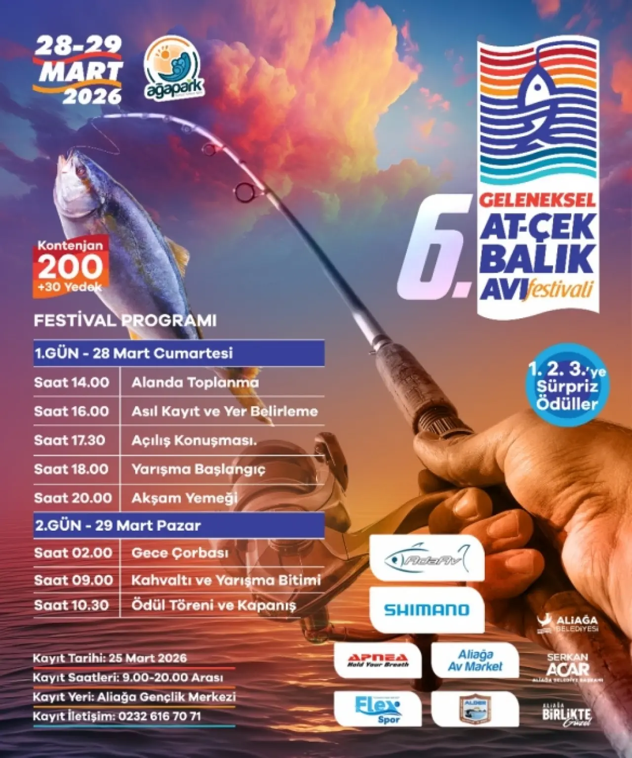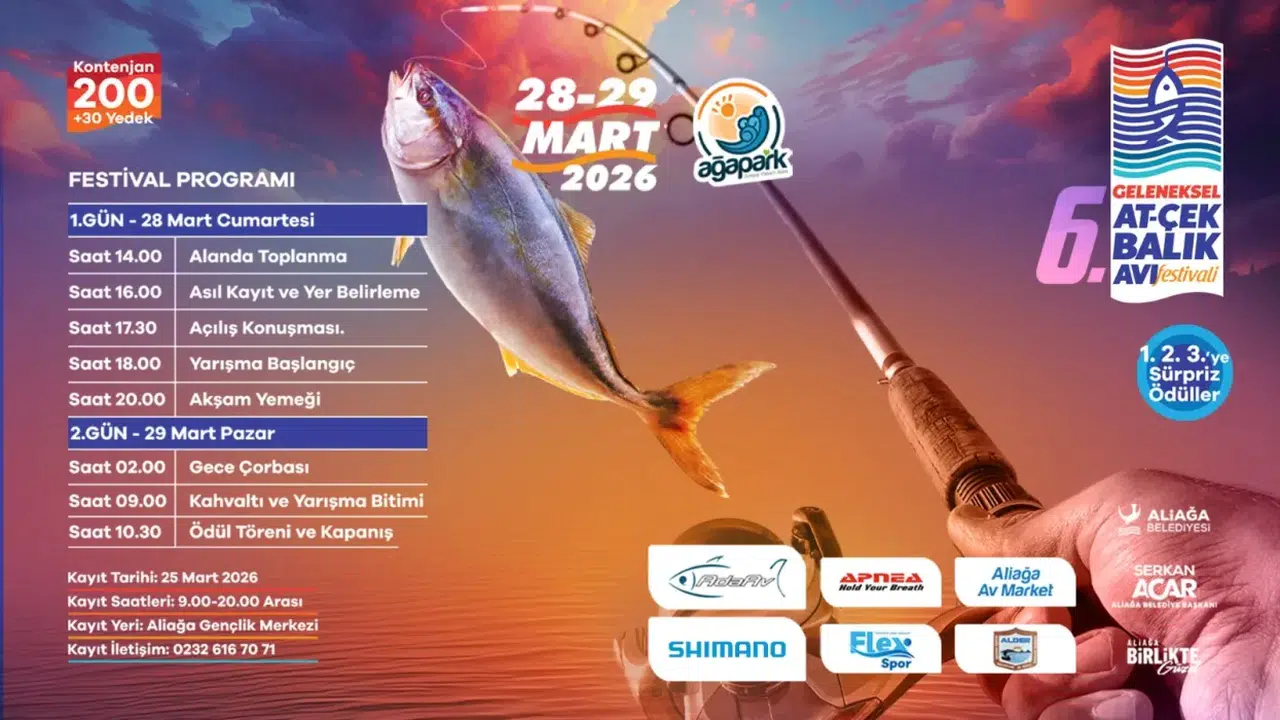 Aliağa'da düzenlenecek 6. At-Çek Balık Avı Festivali, 28-29 Mart 2026'da amatör balıkçılara ev sahipliği yapacak. Başvurular 25 Mart'ta başlıyor.