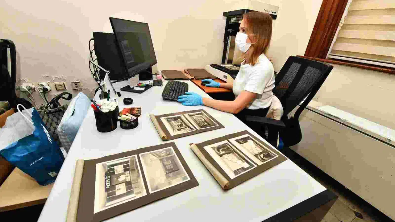 APİKAM’da arşiv ve tasnif çalışması yapan kişi ince yapıdaki belgelerin tahrip olmasını engellemek için eldiven, tozlu belgelerden zarar görmemek için de maske kullanıyor.