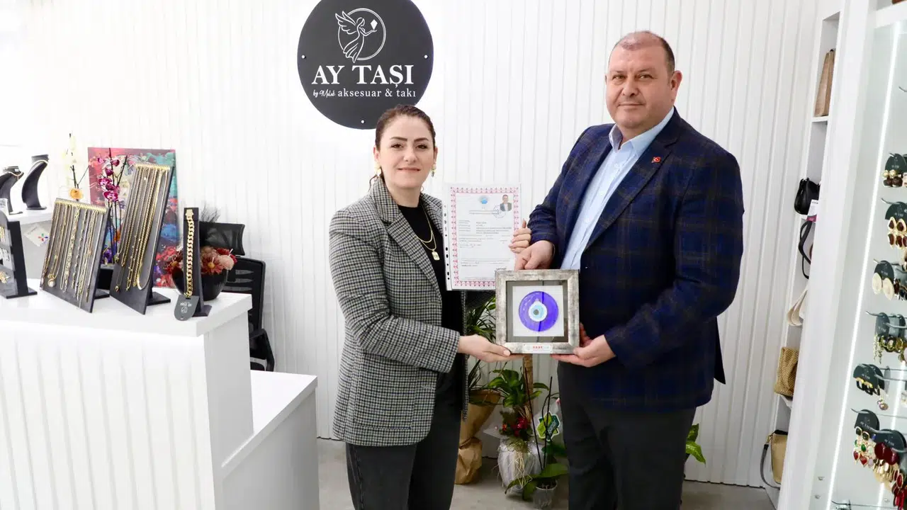 Menderes Belediye Başkanı İlkay Çiçek’in eşi Melek Çiçek’in Menderes’e kazandırdığı Ay Taşı Aksesuar ve Takı işletmesinin ruhsatını Başkan Çiçek kendisi teslim etti. Yapılan sürpriz ziyarette işyeri ruhsatını eşine veren Başkan Çiçek’in sürprizi eşi Melek Çiçek tarafından mutlulukla karşılandı.