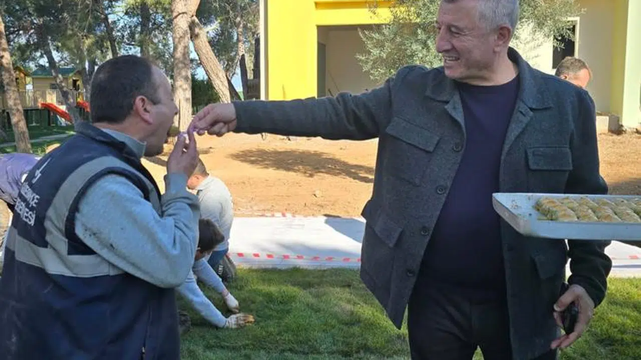 Güzelbahçe Belediye Başkanı Mustafa Günay, sahada emek veren işçilere baklava ikram ederek teşekkür etti. Çalışanlarla omuz omuza olduklarını vurguladı.