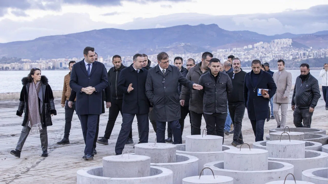 İzmir Büyükşehir Belediye Başkanı Dr. Cemil Tugay, Alsancak Kordon’da deniz taşkınlarını önlemek için başlatılan, aynı zamanda sosyal donatı alanlarıyla kıyı şeridindeki sorunları çözerek estetik bir görünüme kavuşturacak “Kordon Acil Eylem Paketi” çalışmalarını yerinde inceledi. Alsancak Limanı’ndan Cumhuriyet Meydanı’na kadar uzanan çalışma hakkında sahada bilgi alan Başkan Dr. Cemil Tugay’a İzmir Büyükşehir Belediyesi Genel Sekreter Yardımcısı Çağatay Güç, Fen İşleri Dairesi Başkanı Sercan Kahya, Yapı İşleri Dairesi Başkanı Onur Açık, Park ve Bahçeler Dairesi Başkanı Müge Deniz Bal ve birim yöneticileri eşlik etti. Kordon boyunca yürüyen Başkan Tugay, alanda yapımı tamamlanan geçici fırtına duvarını, acil durum kapılarını, zemin ve peyzaj düzenlemelerini teker teker inceledi.