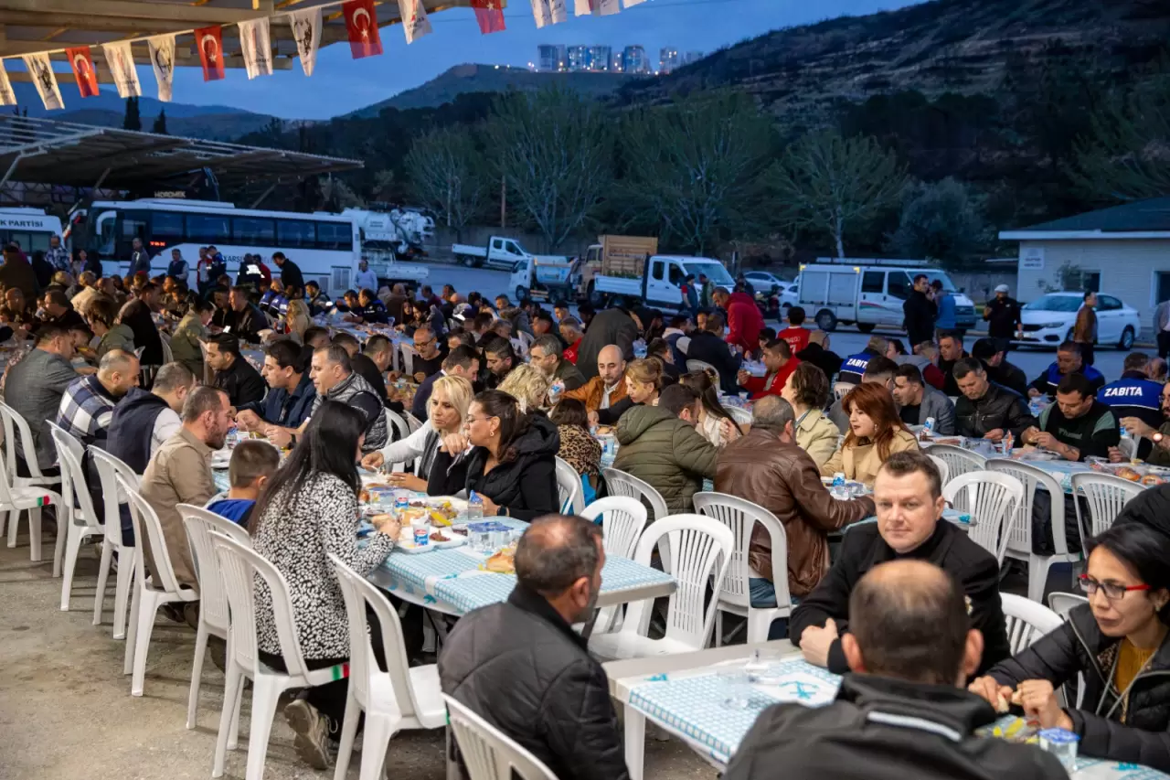 Ramazan ayı boyunca ilçenin dört bir yanında iftar organizasyonları düzenleyen Karşıyaka Belediyesi, yüzlerce kurum çalışanını da aynı sofranın etrafında buluşturdu. Örnekköy Şantiye Tesisleri’nde gerçekleştirilen iftar yemeğine, Karşıyaka Belediye Başkanı Yıldız Ünsal, meclis üyeleri ve bürokratlar da katıldı. Hep birlikte iftar yapan Ünsal ve çalışanlar, birlik ve beraberlik örneği sergiledi. Başkan Ünsal, yıl boyunca sergiledikleri özverili çalışmalar için de personeline teşekkür etti, Ramazan Bayramı’nı kutladı.