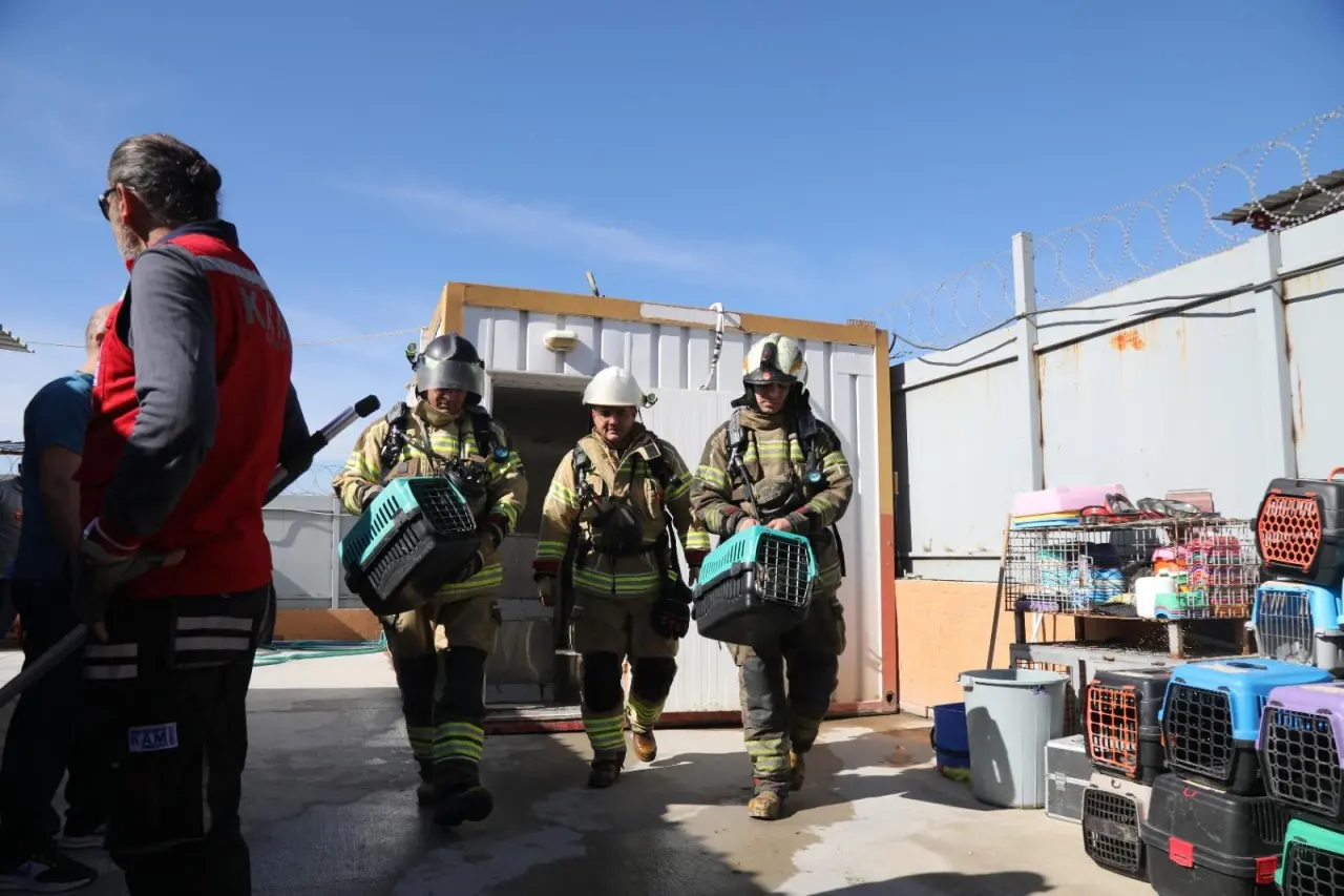Veteriner İşleri ve Afet İşleri müdürlüklerinin iş birliğinde düzenlenen tatbikatta; afet durumlarında hayvan tahliyesi, acil durum yönetimi, kurumlar arası koordinasyon ve iletişim süreçleri test edildi. AFAD İl Müdürlüğü gözlemci olarak yer alırken, çevre ilçe belediyelerinin afet işleri ekipleri de çalışmaya katılım sağladı. Senaryo gereği, merkeze yakın bir bölgede başlayan yangının şiddetli rüzgârla barınağa yaklaşması üzerine acil eylem planı devreye alındı. İzmir İtfaiyesi ekipleri, yangının barınağa sıçramasını önlemek için su perdesi oluşturdu. Dumandan etkilenen personel ve hayvanlar güvenli alanlara tahliye edilirken, özellikle kedi barınağındaki hayvanların kurtarılması titizlikle gerçekleştirildi.