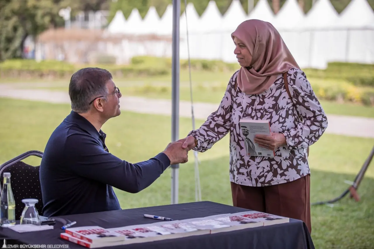 İzmir Büyükşehir Belediye Başkanı Dr. Cemil Tugay, Kültürpark’ta kapılarını açan İZKİTAPFEST - 6. İzmir Kitap Fuarı kapsamında, tutuklu İstanbul Büyükşehir Belediye Başkanı Ekrem İmamoğlu adına gazeteci Yavuz Oğhan’ın kaleme aldığı “Millete Emanet” kitabını İzmirliler için imzaladı. Ekrem İmamoğlu’nun yaşamını, mücadelesini ve ortaya koyduğu çalışmaları anlatan kitabın imza günü, İZKİTAPFEST’in ikinci gününde, Pakistan Pavyonu yanındaki imza alanında gerçekleştirildi. İmza öncesi Kültürpark’a gelen kitapseverlerle kucaklaşan Başkan Tugay, ardından İzmirlilerin kitaplarını imzaladı. Uzun kuyrukların oluştuğu imza etkinliği yaklaşık iki saat sürdü.