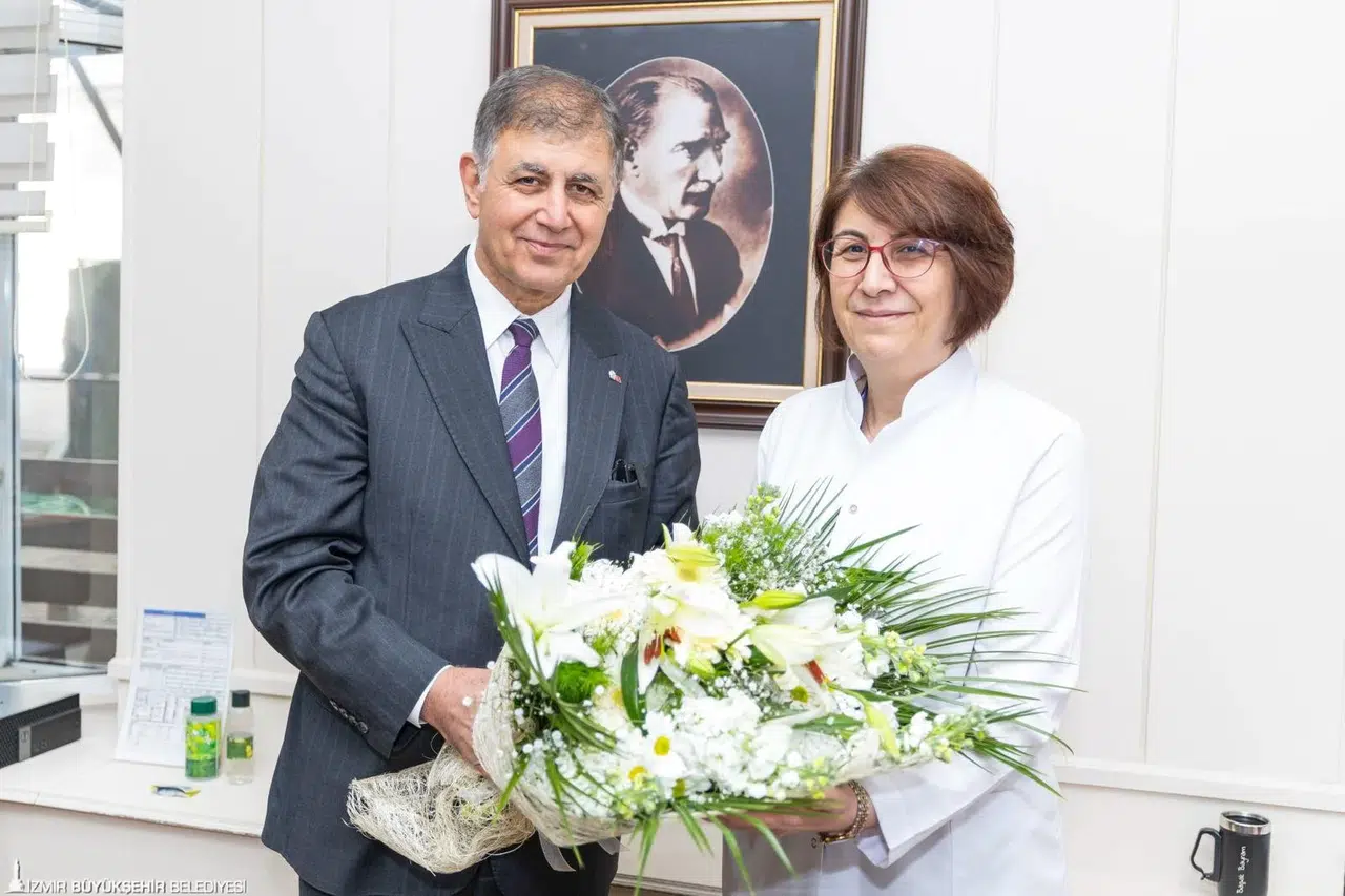 İzmir Büyükşehir Belediye Başkanı Dr. Cemil Tugay, 14 Mart Tıp Bayramı vesilesiyle Türkiye’nin ilk ve tek belediye hastanesi, 118 yıllık Eşrefpaşa Hastanesi’ni ziyaret etti. Aynı zamanda bir hekim olan Başkan Tugay, burada meslektaşları, sağlık çalışanları ve hastane personeli ile selamlaşarak bayramlarını kutladı, hastaneye tedavi olmaya gelen yurttaşlarla sohbet etti. Eşrefpaşa Hastanesi Başhekimi Doç. Dr. Başak Bayram’a çiçek takdim eden Başkan Tugay, hastane ziyareti sırasında bir sürprizle de karşılaştı. İzmir Sağırları Koruma ve Kalkındırma Derneği Başkanı Metin Atak, hastanede işaret dili tercümanlığı hizmetinin başlaması nedeniyle Başkan Tugay’a tüm işitme engelli ve sağır yurttaşlar adına çiçek verdi. Ziyaret kapsamında hastanenin hekimleri ve sağlık çalışanları da bir araya geldi. Başkan Tugay, hem meslek hayatı hem de belediye başkanlığına ilişkin meslektaşları ile sohbet etti. 1972’de Eşrefpaşa Hastanesi’nde doğan ve yine Eşrefpaşa Hastanesi’nde üroloji uzmanı olarak görev yapan Dr. Ural Hamurcu’ya, Eşrefpaşa Hastanesi’nde en uzun süre görev yapan doktorlara ve hastanedeki en genç hekimlere çiçek takdim edildi. Başkan Tugay, ziyareti sırasında Mustafa Kemal Atatürk ve İsmet İnönü imzası taşıyan, Alman başhemşire Margot Konrat’ın Eşrefpaşa Hastanesi’nde çalışma iznine dair farklı yıllara ait iki belgeyi de inceledi.