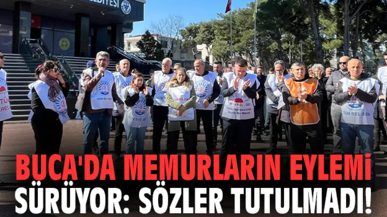 Buca Belediyesi önünde toplanan memurlar, 18 Şubat'tan itibaren haklarının teslim edilmesi talebiyle sürdürdükleri iş bırakma eylemini devam ettirdi.