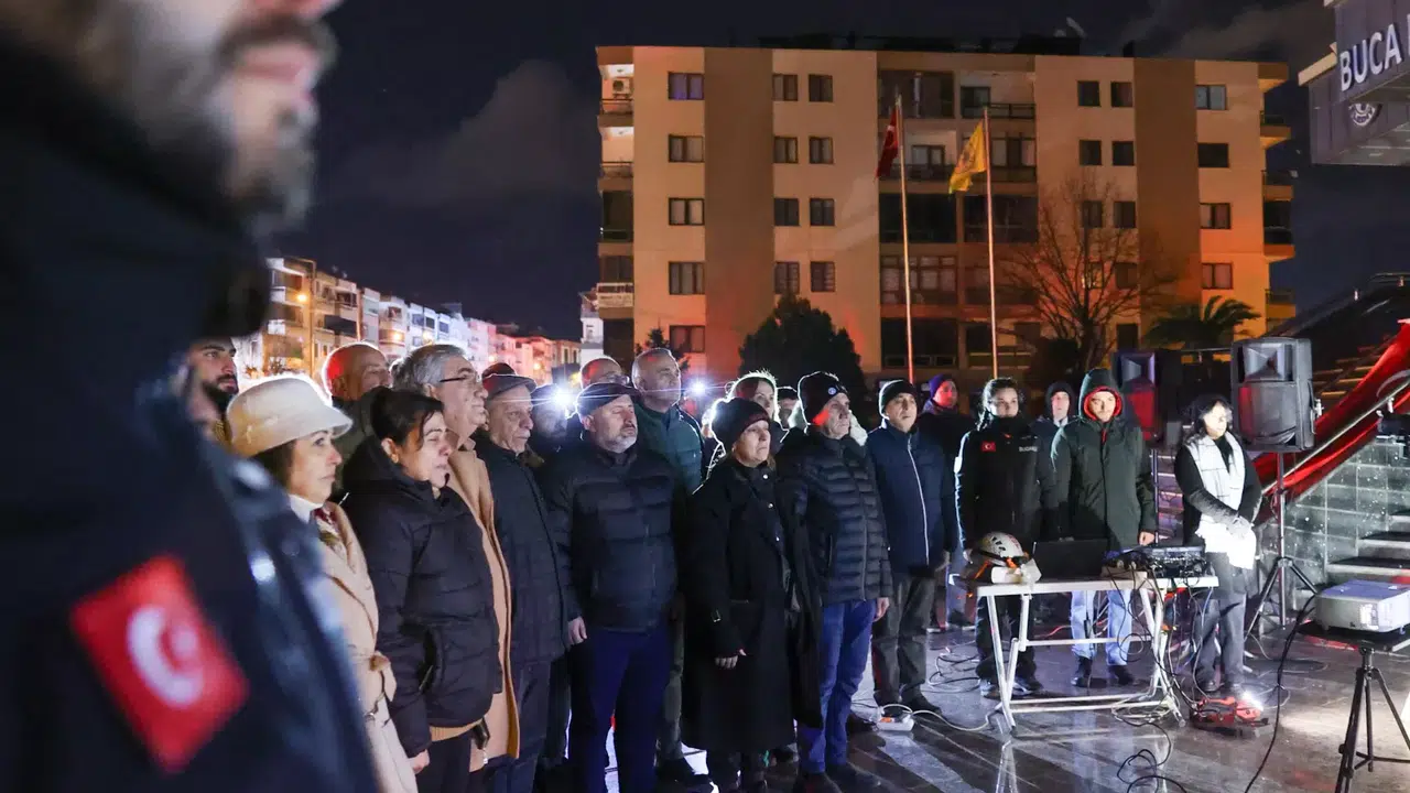 Buca Belediyesi, Kahramanmaraş merkezli 6 Şubat depreminin gerçekleştiği saat olan 04.17’de ana hizmet binası önünde anma töreni düzenledi.