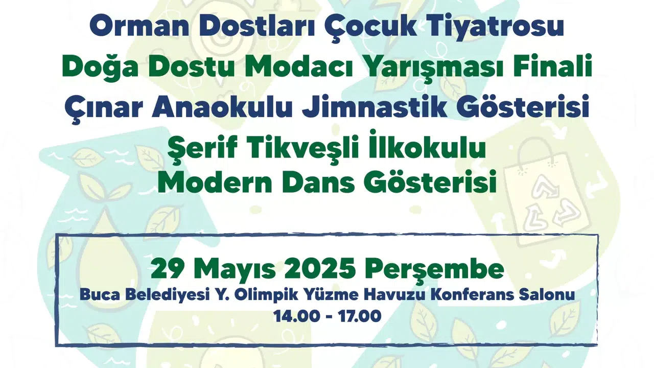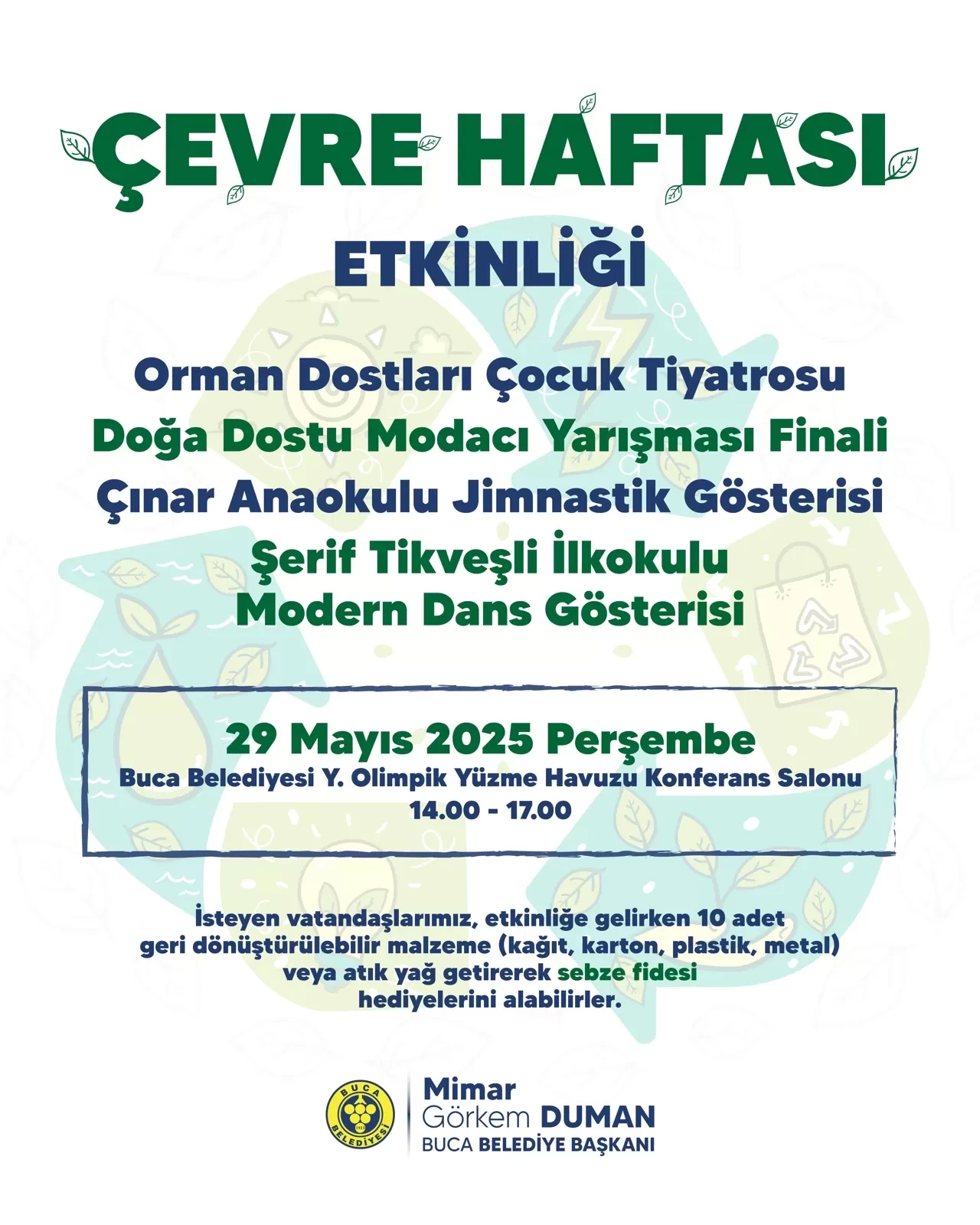 Uyguladığı projelerde sürdürülebilir bir çevre hedefiyle çalışmalar yürüten Buca Belediyesi, Çevre Haftası dolayısıyla dopdolu bir etkinlik programı hazırladı. 29 Mayıs Perşembe günü 14.00–17.00 saatleri arasında Buca Belediyesi Yarı Olimpik Yüzme Havuzu Konferans Salonu’nda gerçekleşecek etkinliklerde Bucalı minikler sahne alacak. Etkinlik kapsamında Orman Dostları Çocuk Tiyatrosu, Çınar Anaokulları'nın jimnastik gösterisi ve Şerif Tikveşli İlkokulu’nun modern dans gösterileri yer alacak.
