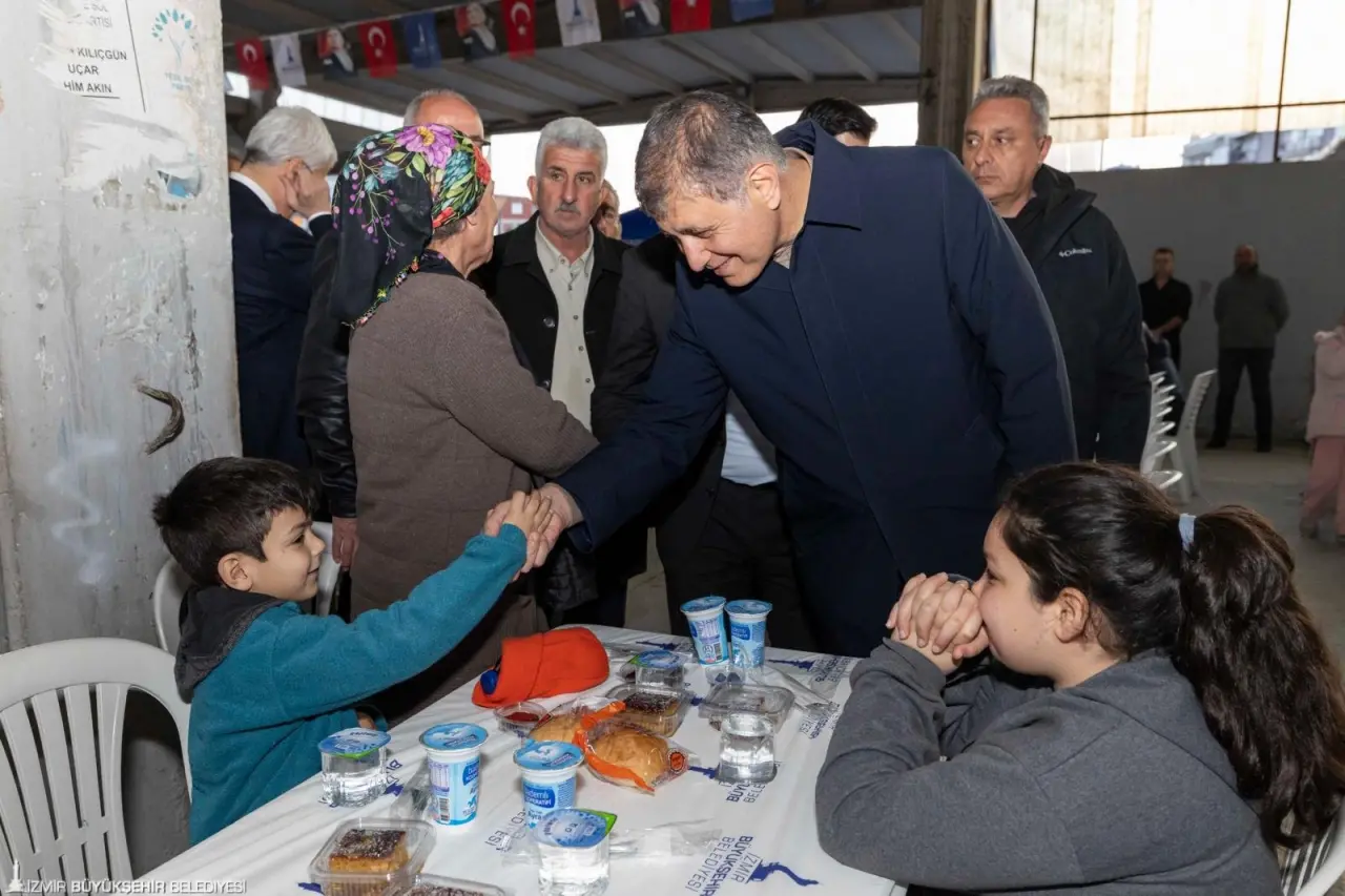 İzmir Büyükşehir Belediyesi’nin ramazan ayı için hazırladığı ve 30 ilçeyi kapsayan iftar programı Menemen’de devam etti. Asarlık Kapalı Pazaryeri’nde düzenlenen buluşmaya İzmir Büyükşehir Belediye Başkanı Dr. Cemil Tugay, CHP İzmir Milletvekili Salih Uzun, CHP Menemen İlçe Başkanı Hüseyin Özbey, belediye meclis üyeleri, siyasi parti temsilcileri, mahalle muhtarları ve yurttaşlar katıldı. İftar öncesi alana gelen Başkan Tugay, masaları tek tek dolaşıp Menemenlilerle selamlaştı; çocuklar ve gençlerle fotoğraf çektirdi, çiçeklerle karşılandı. Kendisine Menemen’in meşhur kırmızı toprağından cep telefonları için üretilen gramofon hediye edildi. Başkan Tugay, iftar sofrasında tıp öğrencisi Zeynep Sude Teke ve ailesiyle birlikte yemek yiyip sohbet etti.