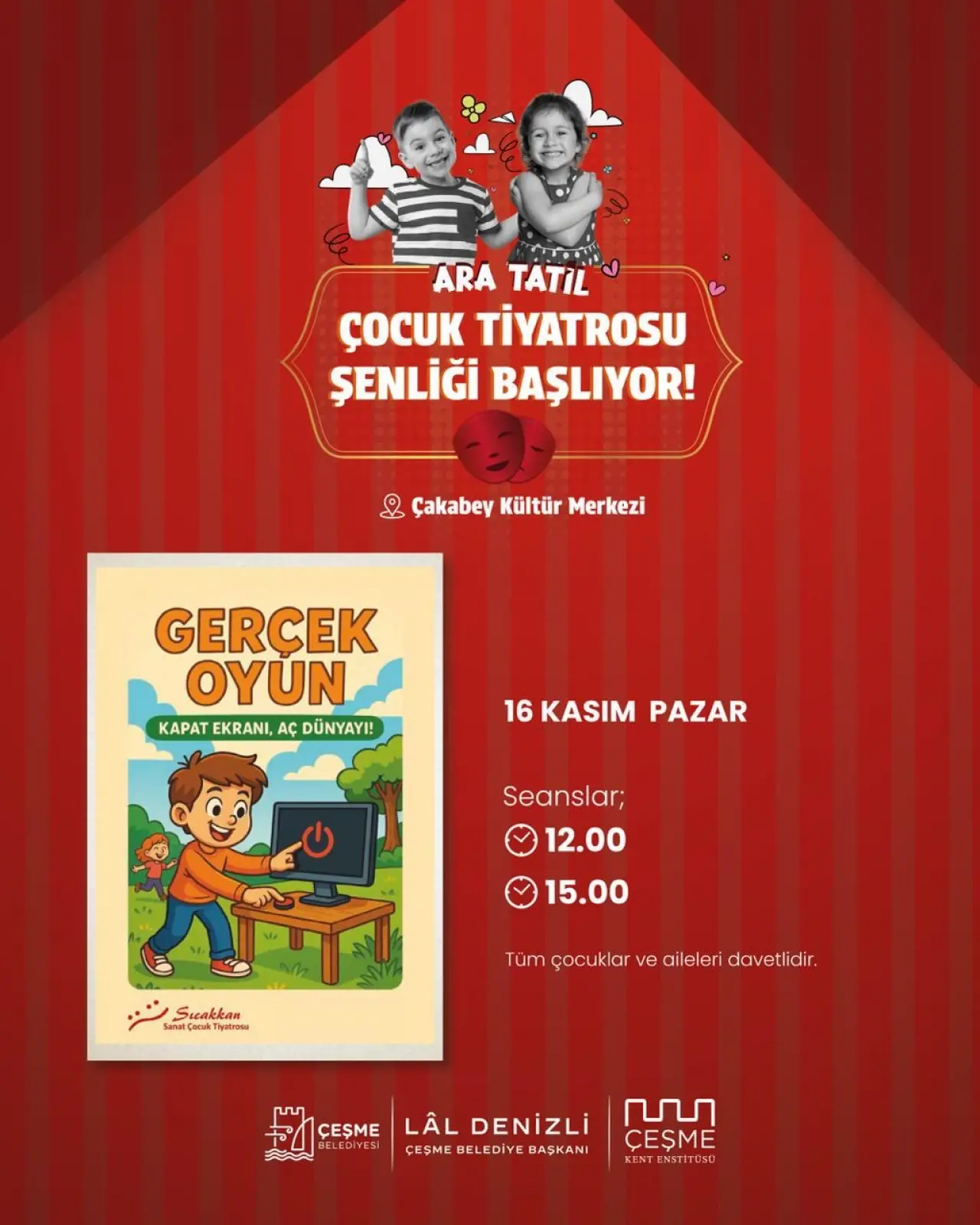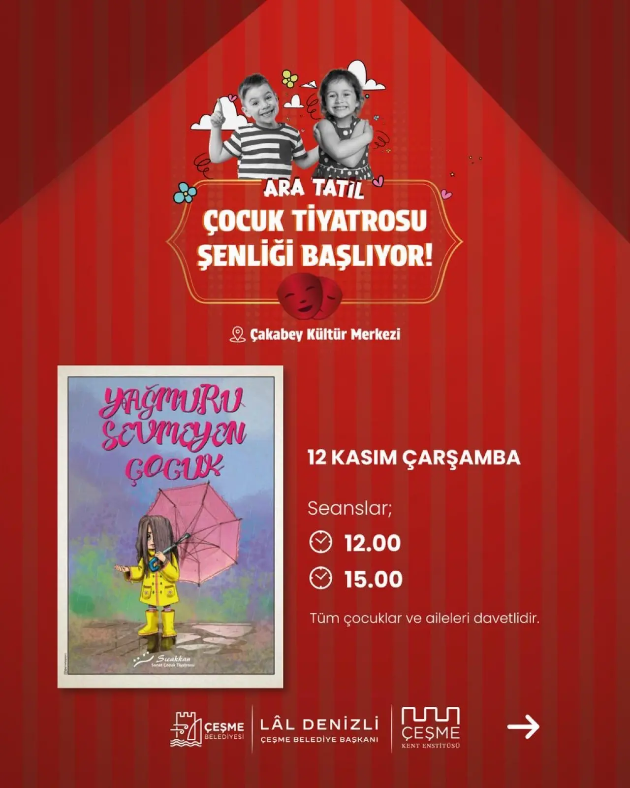 Çeşme Belediyesi, çocuklara eğlenceli ve öğretici bir ara tatil yaşatmak için dopdolu bir tiyatro şenliği düzenliyor.12–16 Kasım tarihleri arasında Çakabey Kültür Merkezi’nde gerçekleşecek “Ara Tatil Çocuk Tiyatrosu Şenliği”, birbirinden renkli oyunlarla minik izleyicileri sahne büyüsüyle buluşturacak.