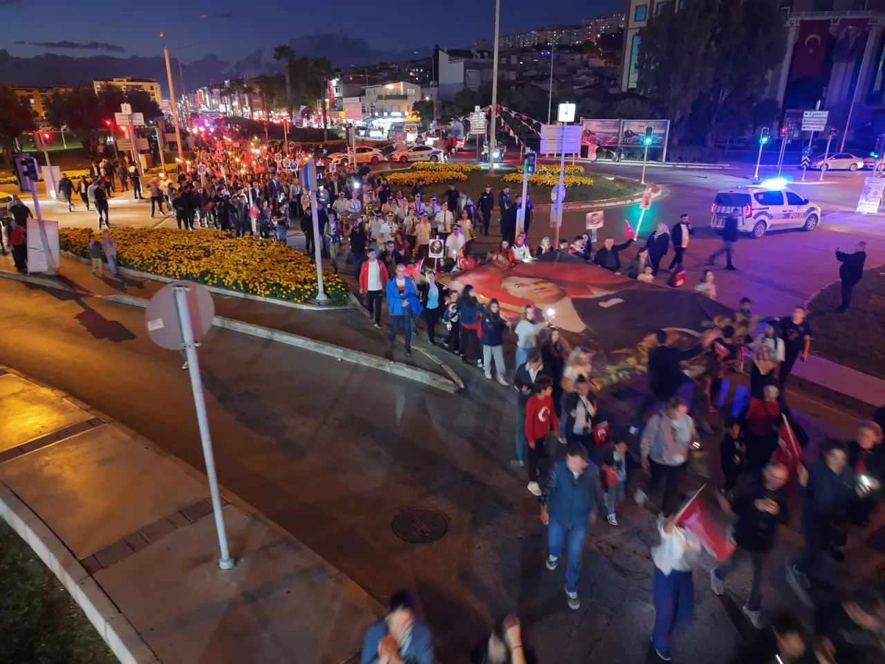 Yürüyüş boyunca taşınan dev Atatürk posteri ve Türk bayrağı, korteje büyük bir coşku kattı. Kent sokaklarında yankılanan marşlar, meşalelerin ışığıyla bütünleşerek unutulmaz bir atmosfer oluşturdu. 102 yıl önce yakılan bağımsızlık meşalesi, Çiğli’de yüzlerce yürek tarafından yeniden geleceğe taşındı.