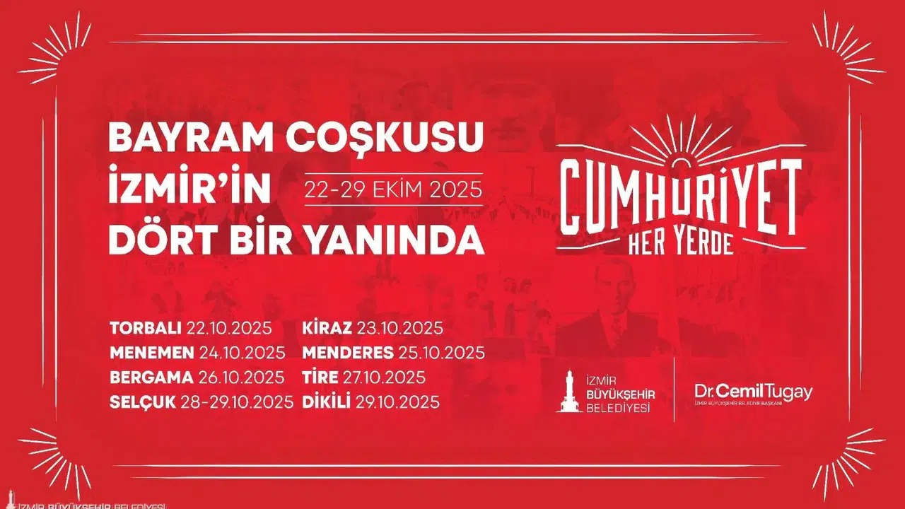 İzmir Büyükşehir Belediyesi, Cumhuriyet Bayramı’nın 102’nci yıl kutlamaları kapsamında bu yıl da “Cumhuriyet Her Yerde” sloganıyla İzmir’in dört bir yanında etkinlikler düzenleyecek. 22-29 Ekim tarihleri arasında gerçekleştirilecek etkinliklerin adresi Torbalı, Menemen, Bergama, Selçuk, Kiraz, Menderes, Tire ve Dikili olacak.
