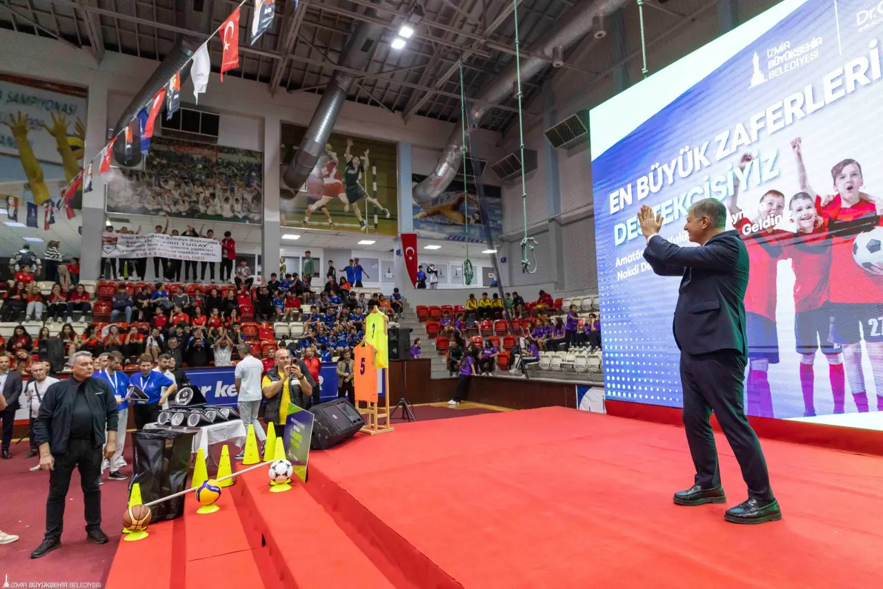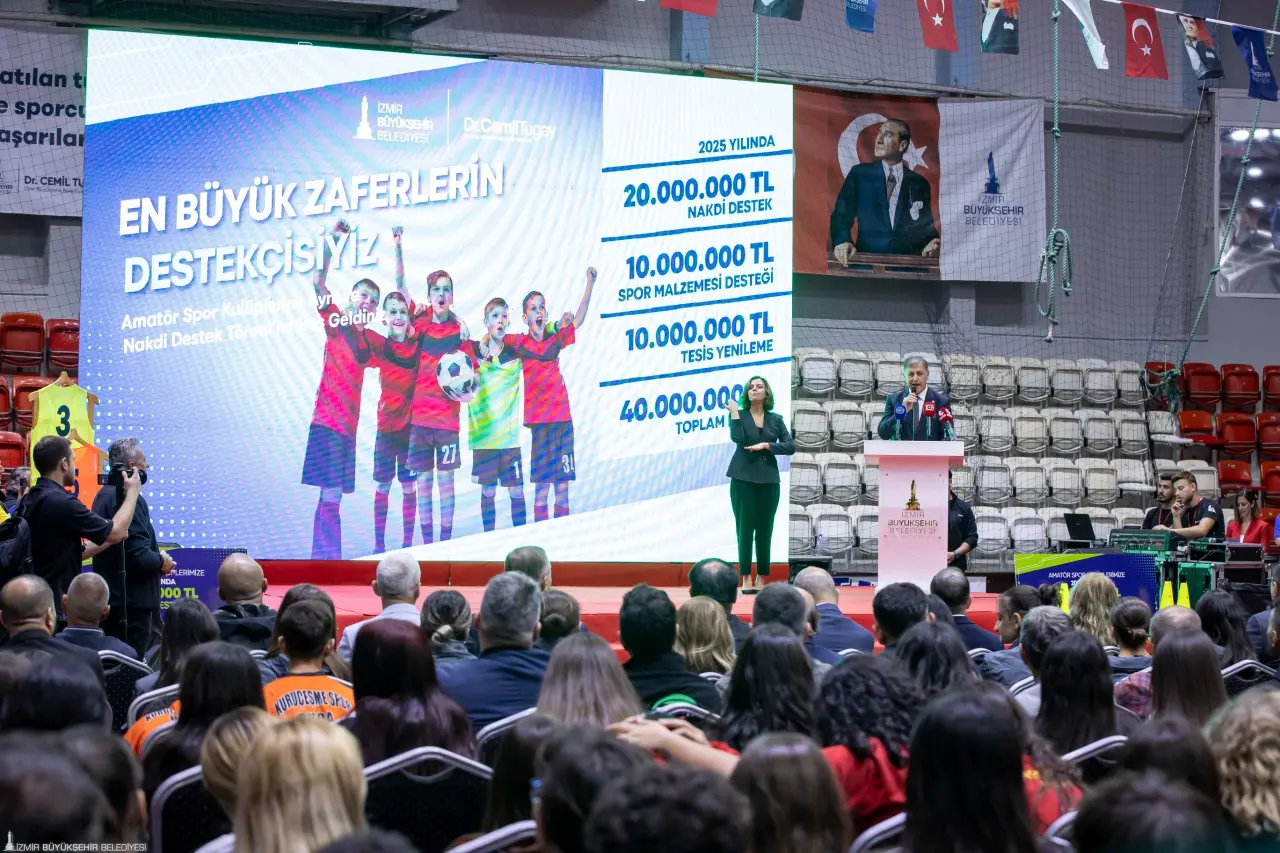 İzmir Büyükşehir Belediyesi, amatör spor kulüplerine verdiği desteği bu yıl daha da arttırdı. 282 amatör spor kulübüne toplam 20 milyon lira nakdi destek sağlandı. 10 milyon liralık spor malzemesi desteği ile tesis bakım ve yenilemeleri için yapılan 10 milyon liralık yatırımla birlikte amatör spora verilen katkı 40 milyon liraya ulaştı. İzmir Büyükşehir Belediye Başkanı Dr. Cemil Tugay, Celal Atik Spor Salonu’nda düzenlenen törende desteklerden yararlanan yaklaşık 3 bin 500 sporcu, antrenör ve kulüp yöneticisi ile bir araya geldi. İzmir Büyükşehir Belediye Başkanı Dr. Cemil Tugay, buluşmada sporun kent yaşamındaki birleştirici gücüne vurgu yaptı.