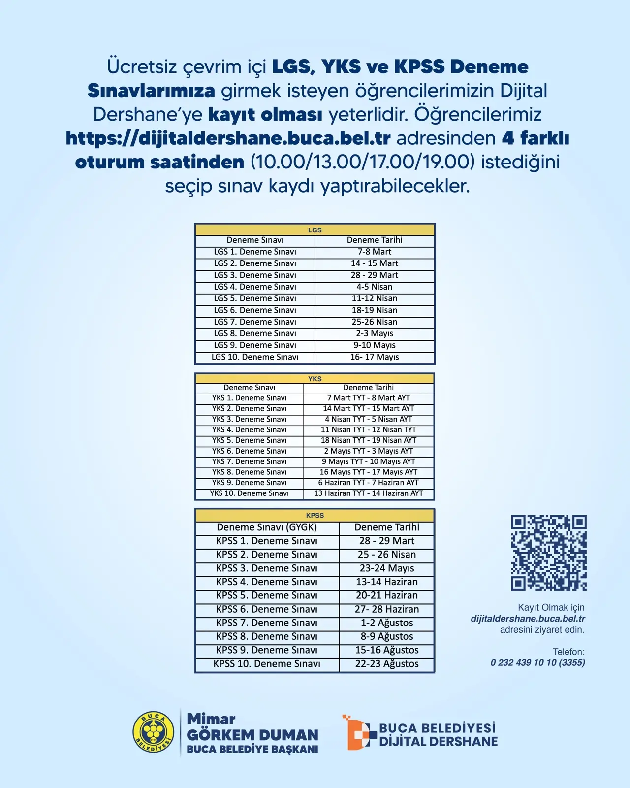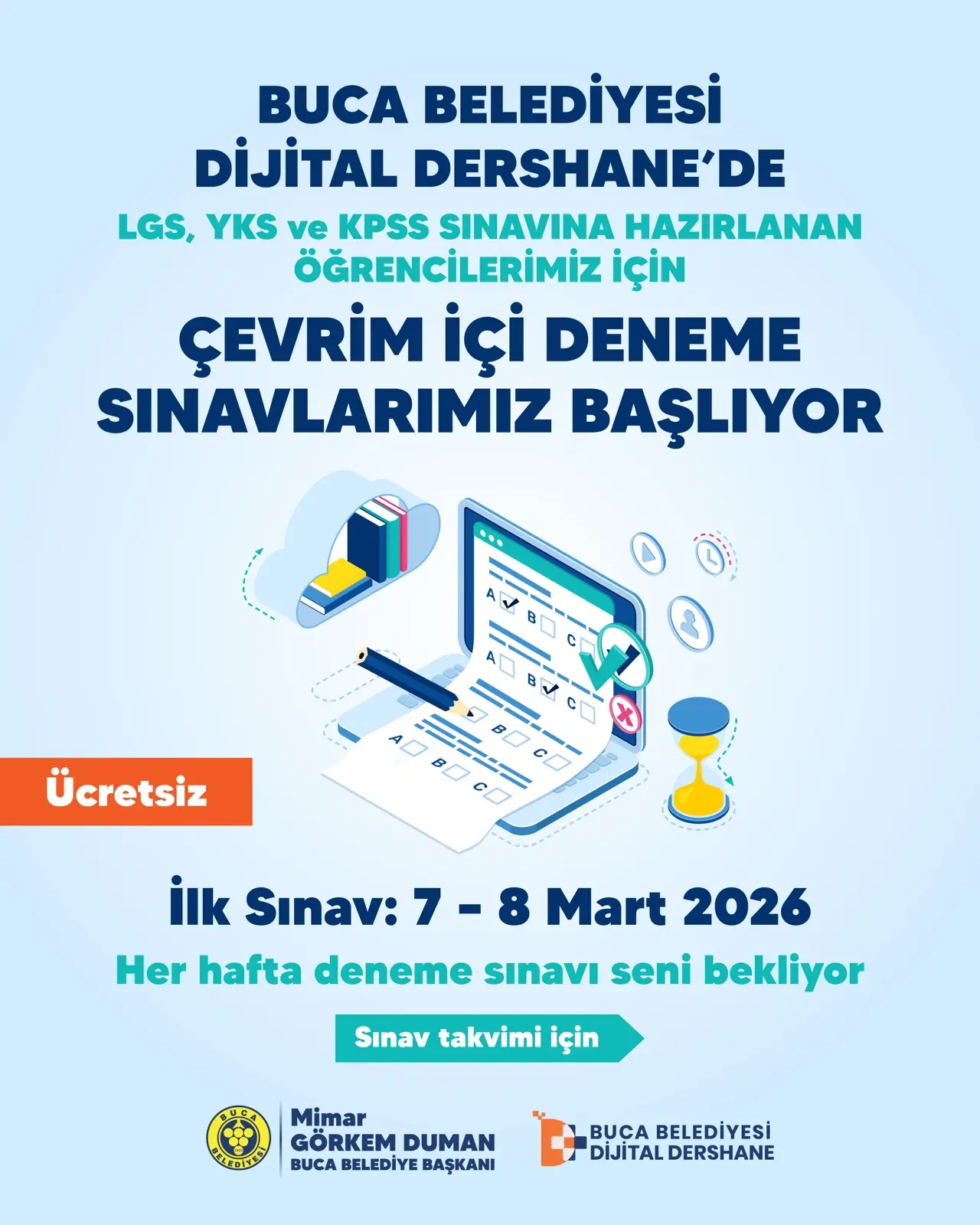 Dijital Dershane’nin, sadece ders anlatılan bir platform değil, gençlerin geleceğini inşa ettiği dev bir eğitim yuvası olduğunu ifade eden Buca Belediye Başkanı Görkem Duman, “Şimdi ise sınav maratonunun en kritik evresine giriyoruz. LGS, YKS ve KPSS’ye hazırlanan gençlerimizin emeklerini taçlandırmak için 10’ar adet seri deneme sınavı başlatıyoruz. Bu sınavlar sadece birer test değil; öğrencilerimizin binlerce akranı arasında kendi seviyesini görmesini sağlayacak, onlara gerçek bir sınav provası yaşatacak büyük bir imkan. Hayallerindeki liseye, üniversiteye veya memuriyete girmek isteyen tüm gençlerimizi bu ücretsiz deneme sınavlarımıza katılmaya davet ediyorum. Unutmayın, siz çalışın, biz her adımda yanınızda olmaya devam edeceğiz" diye konuştu.