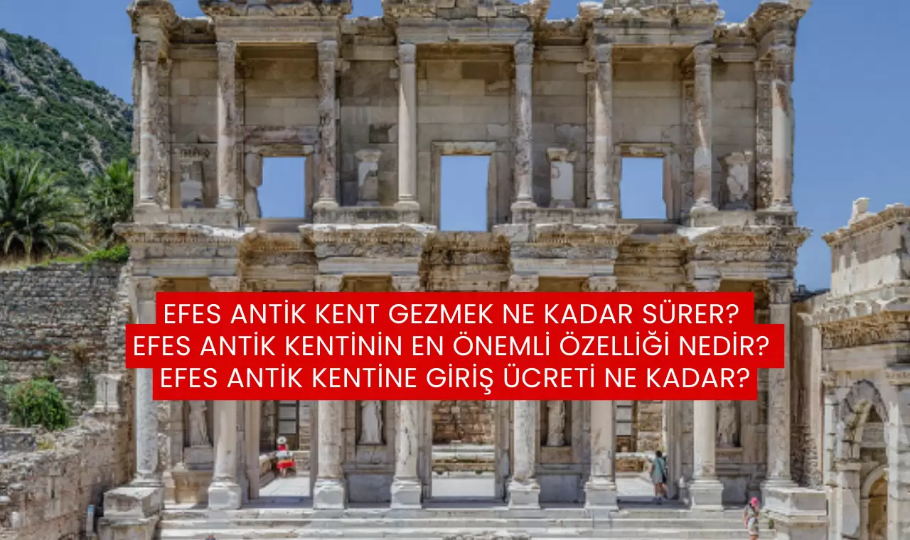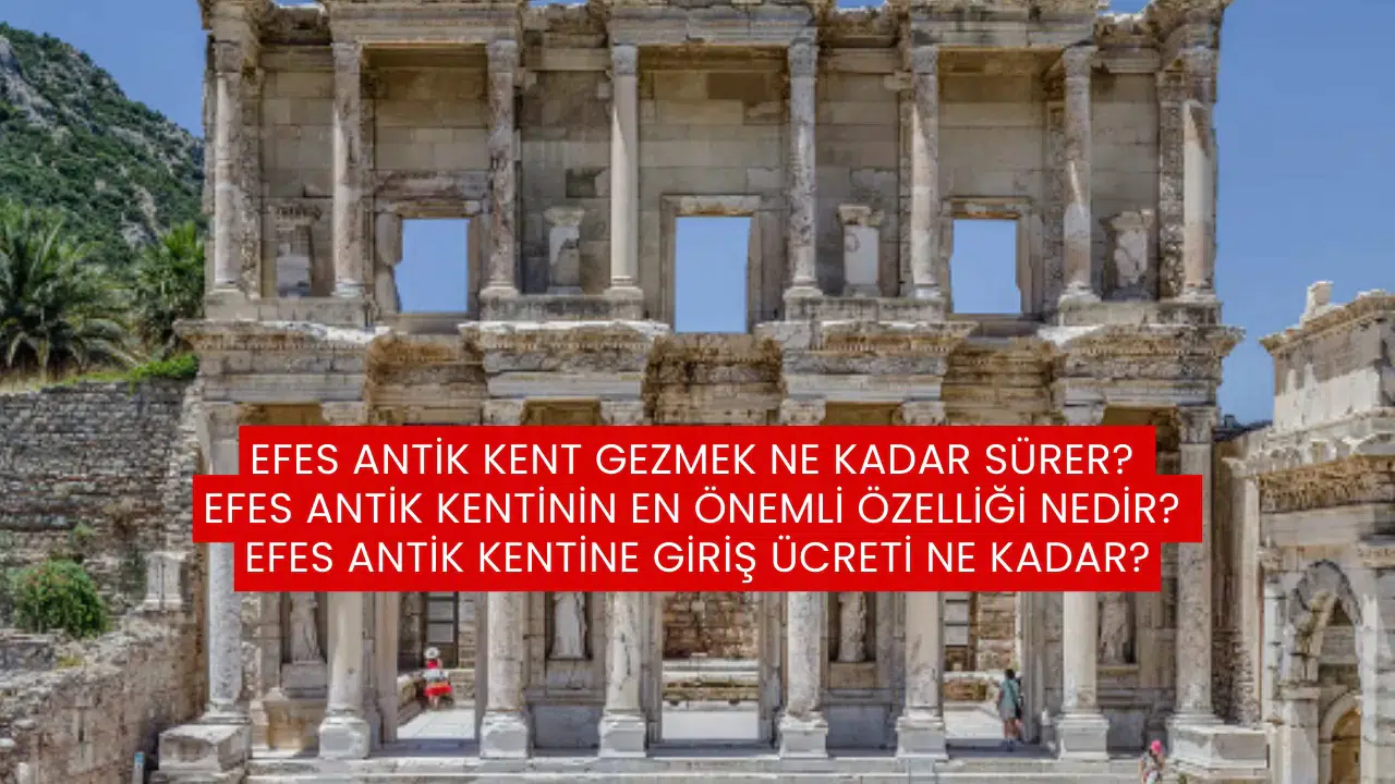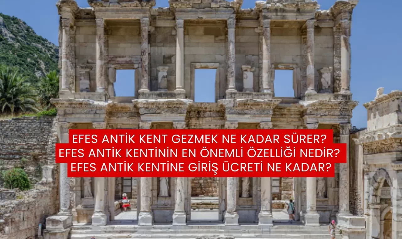 Oldukça geniş bir alana yayılan Efes Antik Kenti'ni tam anlamıyla deneyimlemek için ziyaretçilere en az 3 saat ayırmaları tavsiye edilmektedir. Bu süre, kentin önemli yapılarını ve atmosferini sindirerek gezmek için idealdir. Antik kenti doya doya gezmek ve tarihin izlerini sürmek için daha fazla zaman ayırmak ise çok daha keyifli olacaktır.