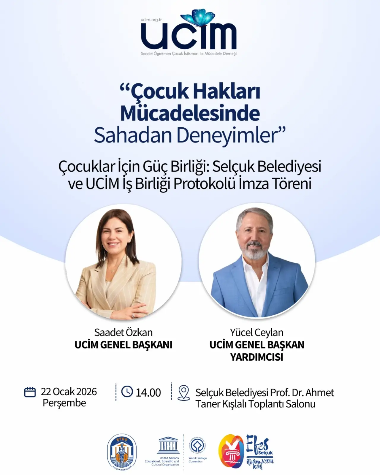 Efes Selçuk Belediyesi ile UCİM (Saadet Öğretmen Çocuk İstismarı ile Mücadele Derneği) arasında çocuk haklarının korunmasına yönelik kapsamlı bir iş birliği protokolü imzalanıyor. Protokol, 22 Ocak Perşembe günü saat 14.00’te Prof. Dr. Ahmet Taner Kışlalı Toplantı Salonu’nda imzalanacak.