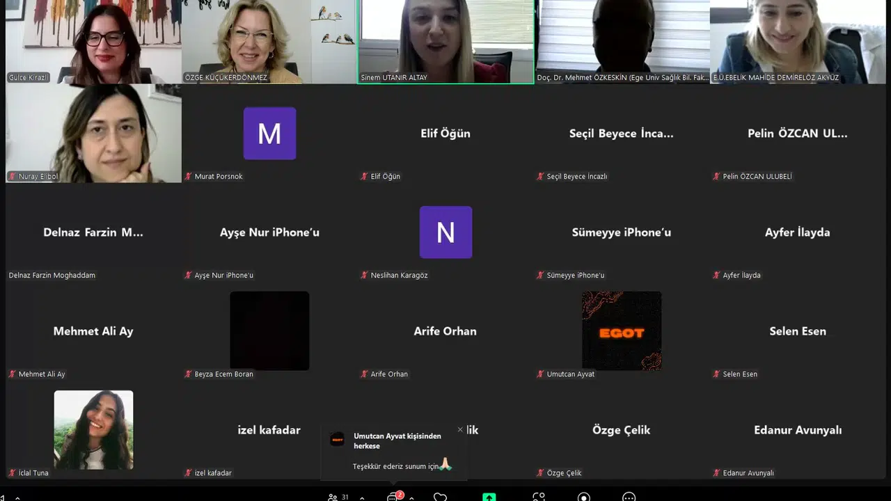 Ege Üniversitesi(EÜ) Sağlık Bilimleri Fakültesinde, “70. Yıl Kültür-Sanat, Millî ve Meslekî Günler Komisyonu Etkinlikleri” kapsamında Odyoloji Bölümü Başkan Yardımcısı Dr. Öğr. Üyesi Gülce Kirazlı’nın moderatörlüğünde “Kadın Emeği ve Cam Tavan” başlıklı söyleşi düzenlendi. Çevirimiçi yapılan etkinliğe, Sağlık Bilimleri Fakültesi Dekan Yardımcısı Doç. Dr. Mehmet Özkeskin, akademisyenler, idari çalışanlar ve öğrenciler katıldı. Söyleşi de konuşmacı olarak EÜ Atatürk Sağlık Hizmetleri Meslek Yüksekokulu Tıbbi Dokümantasyon ve Sekreterlik Bölümü Dr. Öğretim Üyesi Sinem Utanır Altay yer aldı.