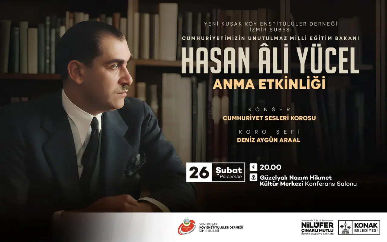 Köy Enstitülerinin mimarı ve Cumhuriyet’in unutulmaz Milli Eğitim Bakanı Hasan Ali Yücel, vefatının 65. yılında Konak’ta anılacak. Konak Belediyesi ve Yeni Kuşak Köy Enstitülüler Derneği İzmir Şubesi iş birliğiyle 26 Şubat Perşembe günü gerçekleşecek gecede, Şef Deniz Aygün Araal yönetimindeki Cumhuriyet Sesleri Korosu sahne alacak.