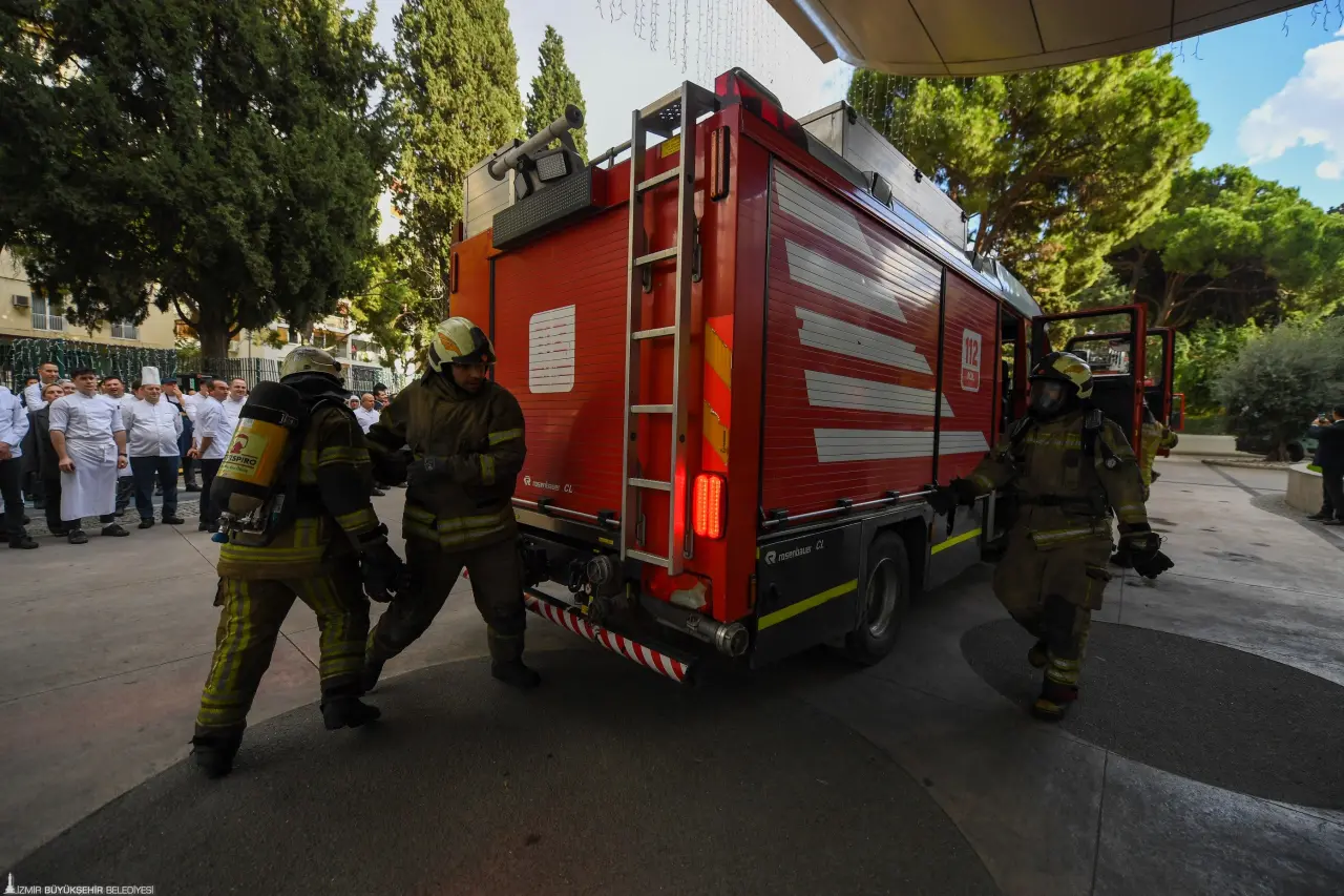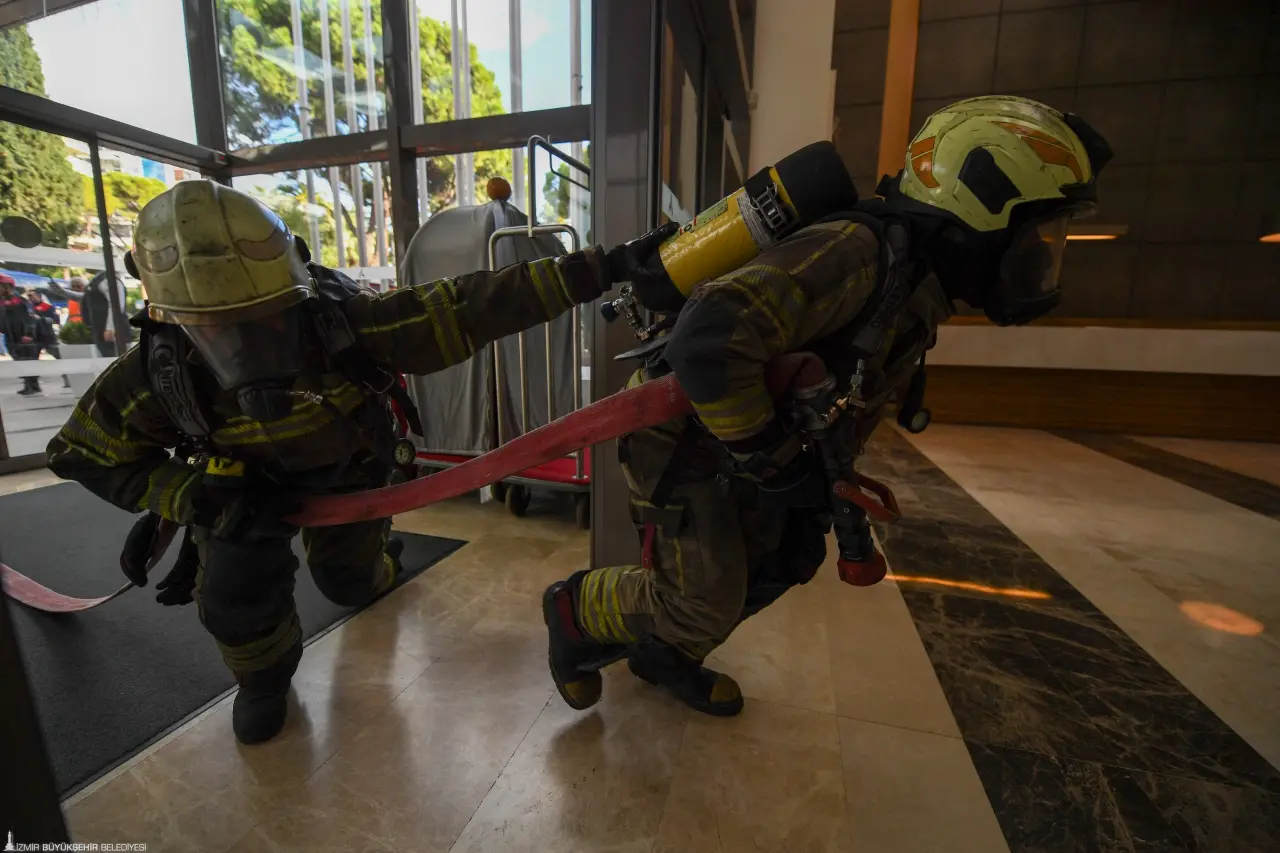 İzmir’in Konak ilçesine bağlı Alsancak Mahallesi Gazi Osman Paşa Bulvarı üzerinde bulunan Swissotel Büyük Efes’te, İzmir Büyükşehir Belediyesi İtfaiye Dairesi Başkanlığı ekipleri yangın ve tahliye tatbikatı düzenlendi. Otel personelinin olası acil durumlara hazırlık seviyesini artırmayı amaçlayan tatbikat senaryosuna göre, yedi katlı binanın giriş katındaki toplantı ve konferans salonunda belirlenemeyen bir nedenle yangın çıktı.