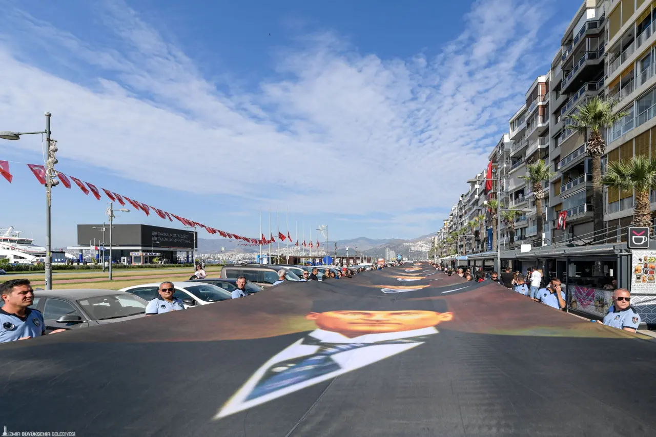 Türkiye Cumhuriyeti’nin kurucusu Ulu Önder Gazi Mustafa Kemal Atatürk, aramızdan ayrılışının 87. yılında çok sayıda etkinlikle anılıyor. Bu kapsamda 350 metrelik dev Atatürk posteri ile “Ata’ya Saygı Yürüyüşü” düzenlendi. İzmir Büyükşehir Belediyesi Başkan Vekili Dr. Zafer Levent Yıldır, CHP İzmir Milletvekili Ednan Arslan, CHP İzmir İl Başkanı Çağatay Güç, İzmir Büyükşehir Belediye Meclisi CHP Grup Başkanvekili Altan İnanç, İzmir Büyükşehir Belediye Meclisi CHP Grup Sözcüsü Yağmur Yurdakul Özkan, Selçuk Belediye Başkanı Filiz Ceritoğlu Sengel, Bornova Belediye Başkanı Ömer Eşki, Gaziemir Belediye Başkanı Ünal Işık, Foça Belediye Başkanı Saniye Bora Fıçı, siyasi parti temsilcileri, spor kulüplerinin sporcuları, sivil toplum kuruluşları, odalar, derneklerin başkanları ile temsilcileri ve vatandaşlar katıldı.