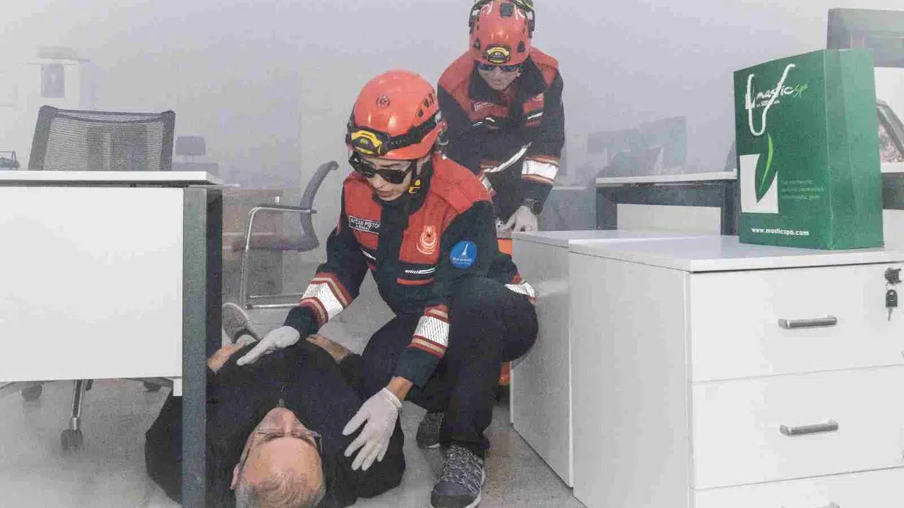 İzmir Büyükşehir Belediyesi İnsan Kaynakları ve Eğitim Dairesi Başkanlığı İş Sağlığı ve Güvenliği Şube Müdürlüğü ile İtfaiye Dairesi Başkanlığı Kültürpark’taki hizmet birimlerinde yangın tatbikatı düzenledi. Birimlerde çalışan yaklaşık 3 bin personel olası yangın ve deprem gibi acil durumlarda, neler yapılması gerektiği konusunda bilinçlendirildi. Tatbikat, sirenlerin çalmasıyla başladı. Sis makineleriyle yapay duman üretilen binada personel güvenli bir şekilde dışarı çıkarıldı. Engelli, hamile veya kronik rahatsızlığı olan risk grubundaki çalışanlar da acil durumlar için önceden belirlenmiş refakatçileri eşliğinde binayı terk etti. Çalışanlar, alana çekilen güvenlik şeridinin arkasına alındı. Senaryo gereği dumandan etkilenen bazı çalışanlar, İtfaiye Dairesi Başkanlığı’na bağlı paramedikler tarafından sedyeyle çıkarılarak, 112 Acil Kurtarma Sağlık (AKS) ambulansına bindirildi. Merdivenli bir itfaiye aracı da çatıdaki yangına müdahale anını canlandırdı. Tatbikat, itfaiye ekiplerinin senaryo gereği yangına müdahalesiyle sona erdi.