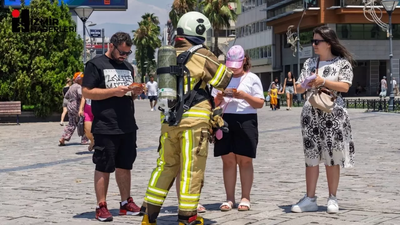 İzmir Büyükşehir Belediyesi İtfaiye Dairesi Başkanlığı, çoğu küçük ihmaller sonucu başlayan ve geride yıkıcı bir etki bırakan orman yangınlarına karşı ilginç bir farkındalık etkinliği düzenledi. Yangınlara müdahale ederken kullandıkları ısıya ve aleve karşı koruyan özel kıyafet giyen, baret ve temiz hava solunum cihazı takan itfaiye personeli, Konak Atatürk Meydanı ile Kemeraltı Çarşısı’nda broşür dağıtarak yurttaşları bu konuda dikkatli olmaya çağırdı. 40 dereceye yaklaşan sıcak havada koruyucu kıyafetle dolaşan itfaiye personelini gören vatandaşlar şaşkınlığını gizleyemedi.