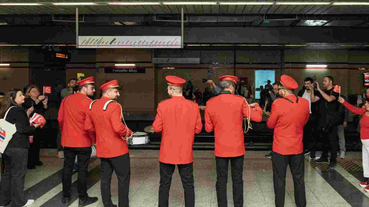 Türkiye Cumhuriyeti’nin kuruluşunun 101. yılı, İzmir’de büyük bir coşkuyla kutlanmaya devam ediyor. Günün son saatlerine kadar devam edecek 29 Ekim Cumhuriyet Bayramı kutlamaları kapsamında İzmir Büyükşehir Belediyesi Bando Ekibi, İzmirlilere sürpriz yaptı. Fahrettin Altay İstasyonu'ndan metroya binen bando ekibi; Konak, Çankaya ve Bornova istasyonlarında marşlarla İzmirliler'in 29 Ekim Cumhuriyet Bayramı’nı kutladı. İzmir Metrosu'nda yolculuk yapan yurttaşlar Cumhuriyet coşkusunu doyasıya yaşayarak, bayraklar ve alkışlarla marşlara eşlik etti.