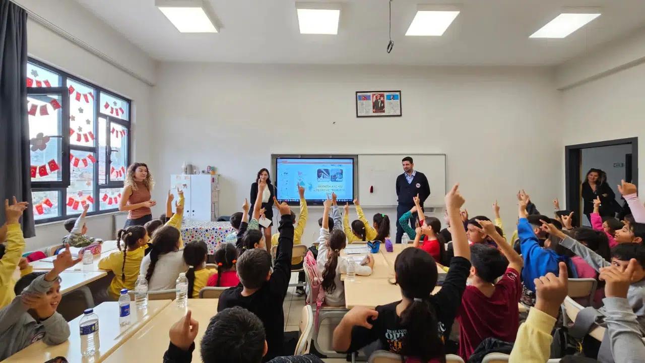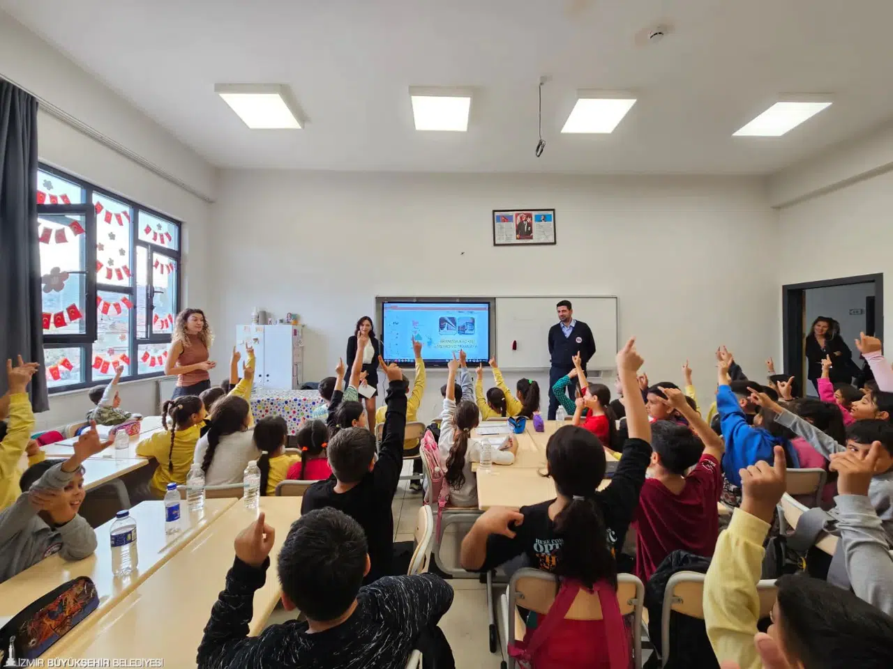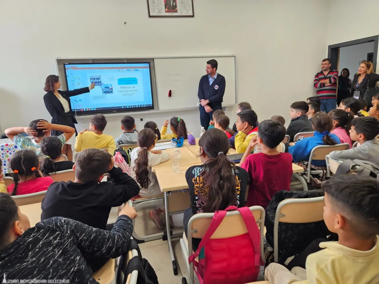 İzmir Metro AŞ Gazi Osman Paşa İlkokulu’ndaki 320 öğrenciye metro ve tramvay sistemlerinin güvenli kullanımı konusunda eğitim verdi. Çocuklar vatmana sorular sorarak merak ettiklerini öğrendi.